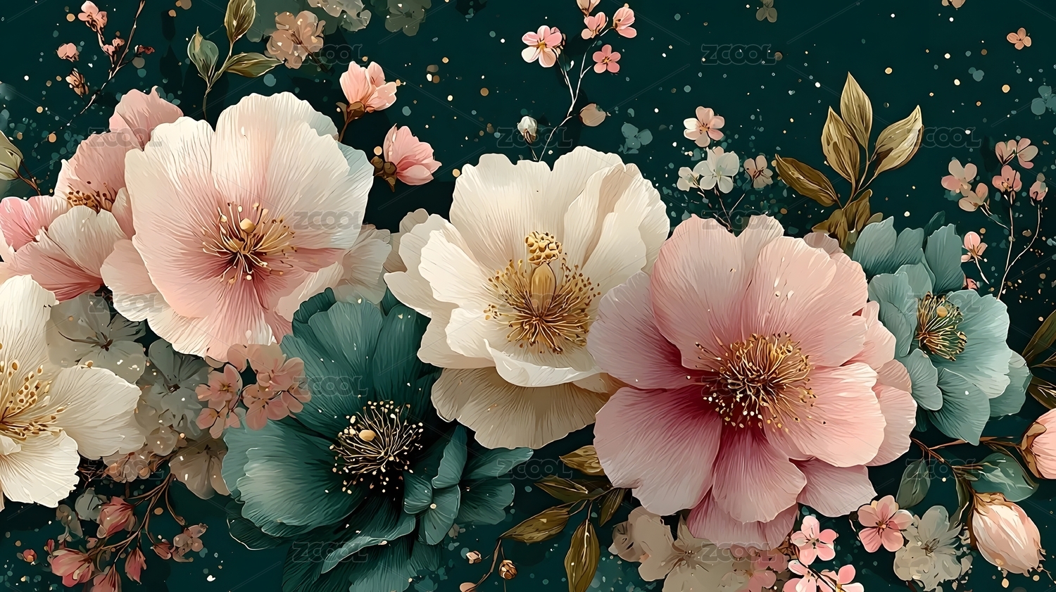 红牡丹簇拥在翠蓝底纹上绽放,优雅静谧
