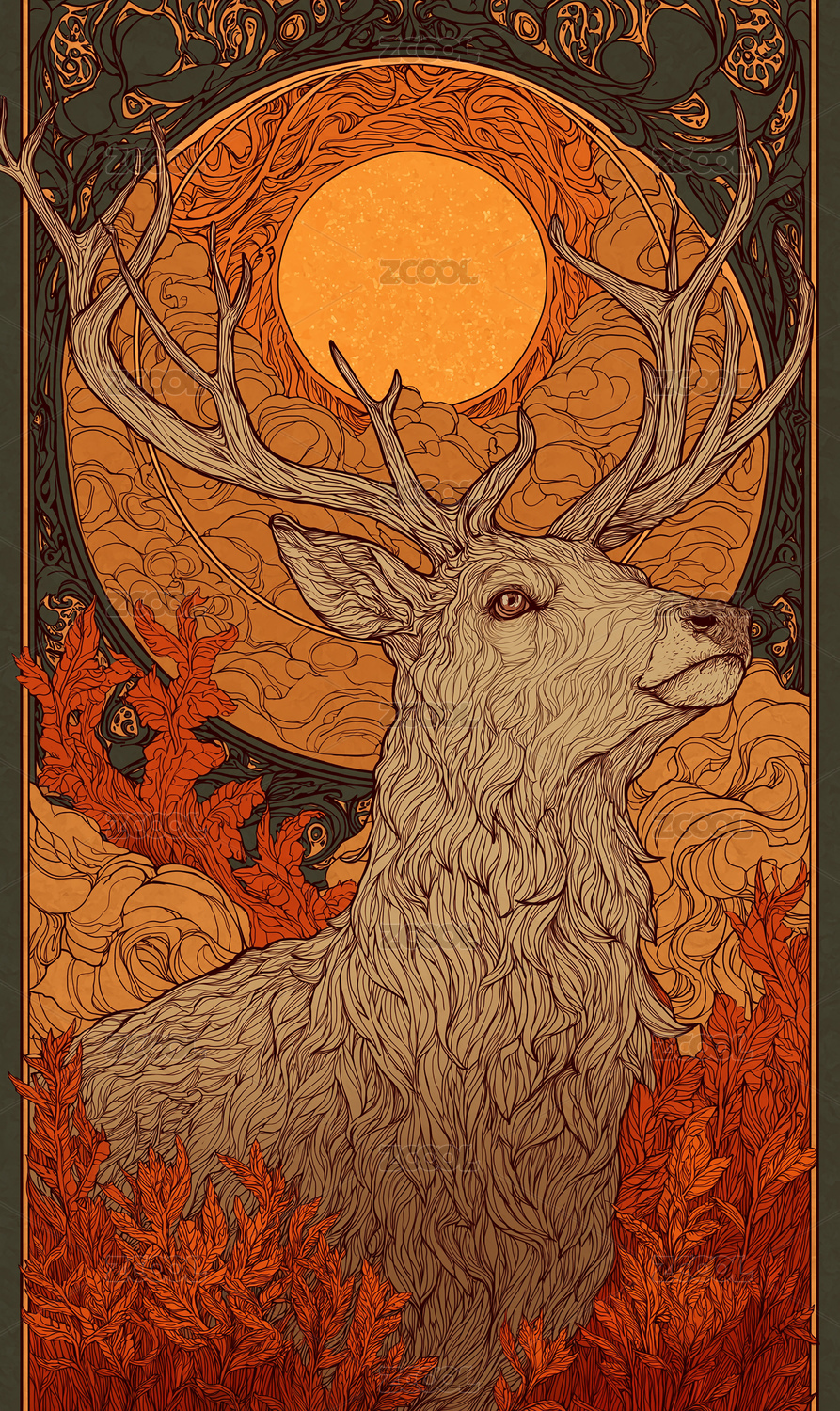 复古,插画,鹿,圆月,森林,装饰,艺术,素材,自然,奇幻