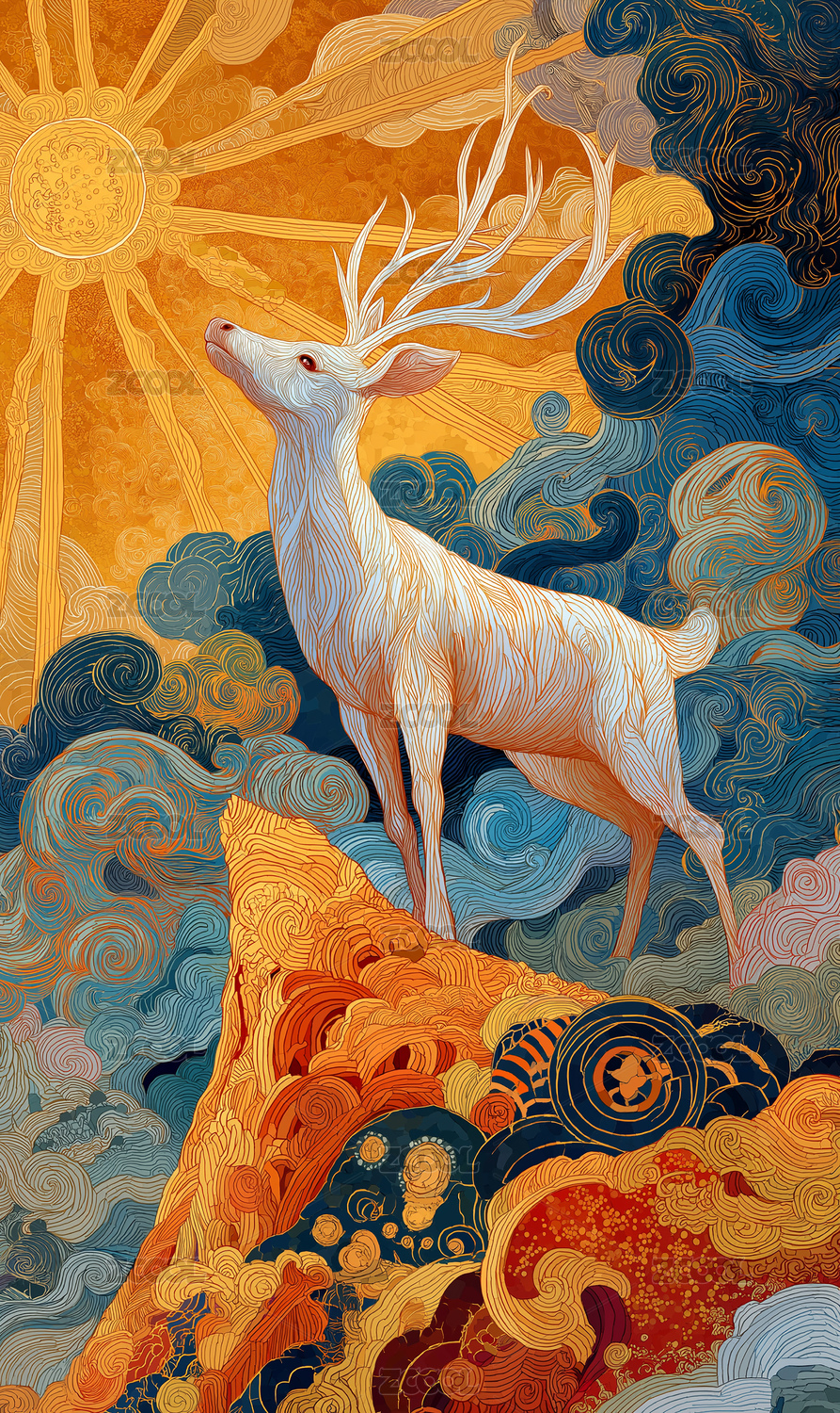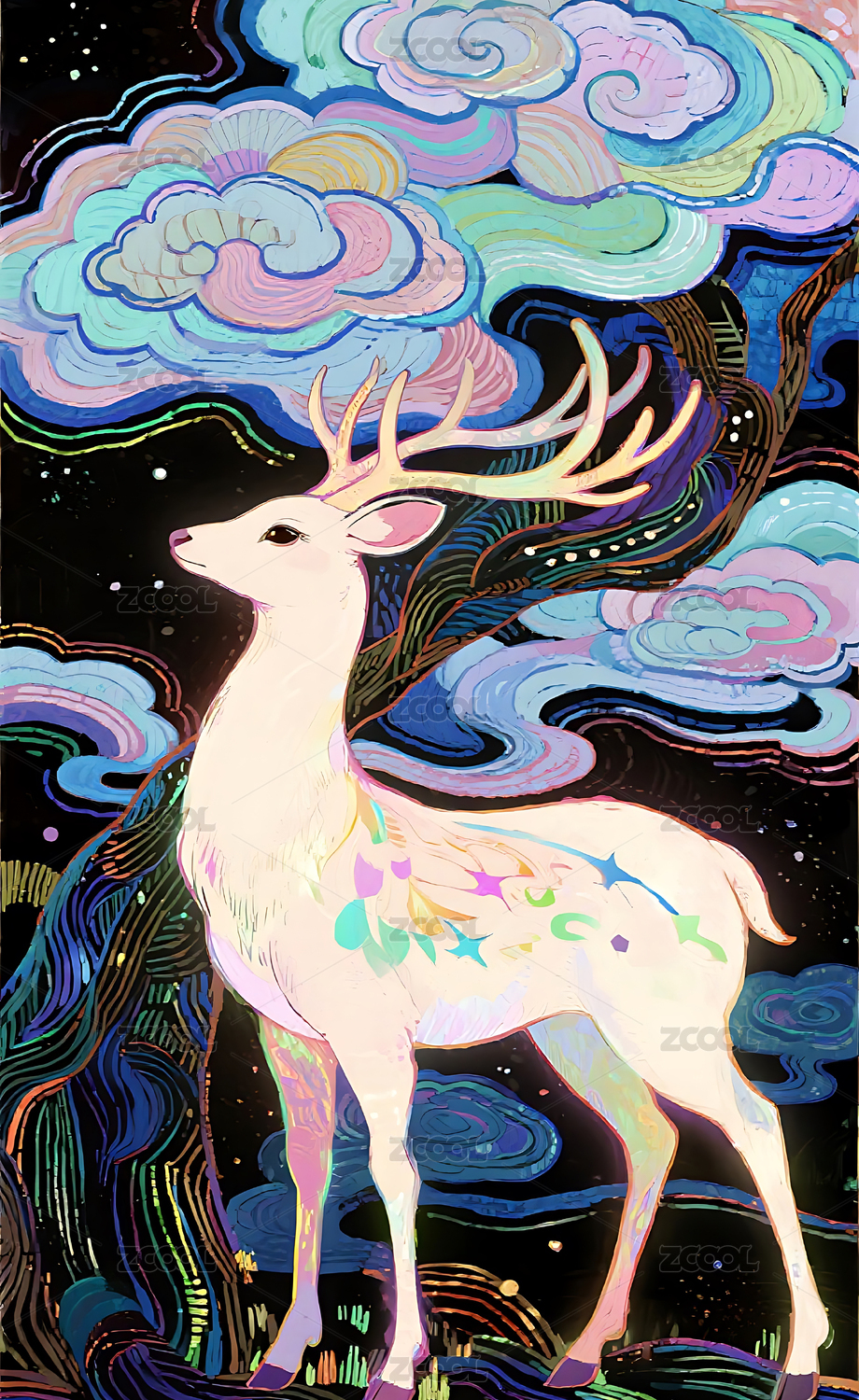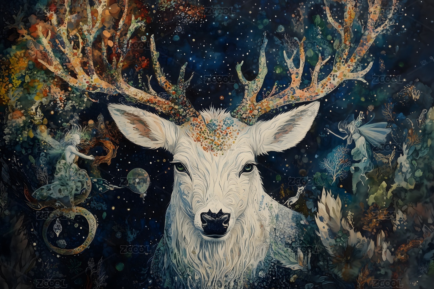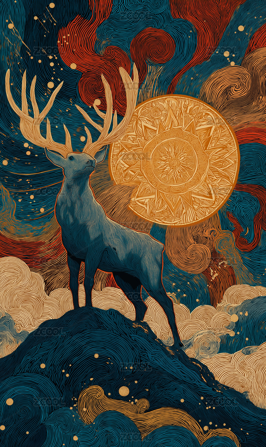 复古,插画,鹿,圆月,森林,装饰,艺术,素材,自然,奇幻