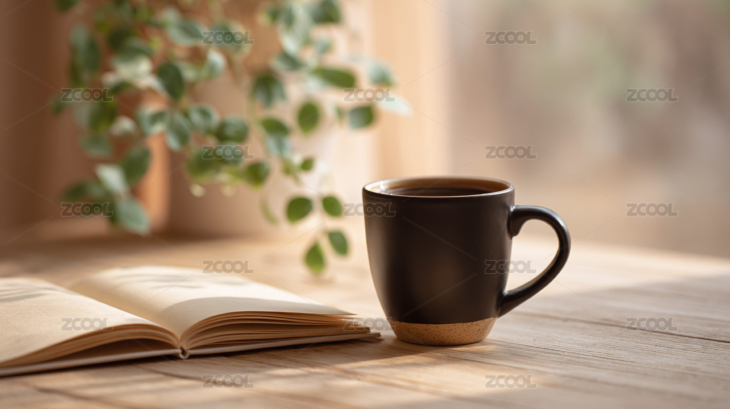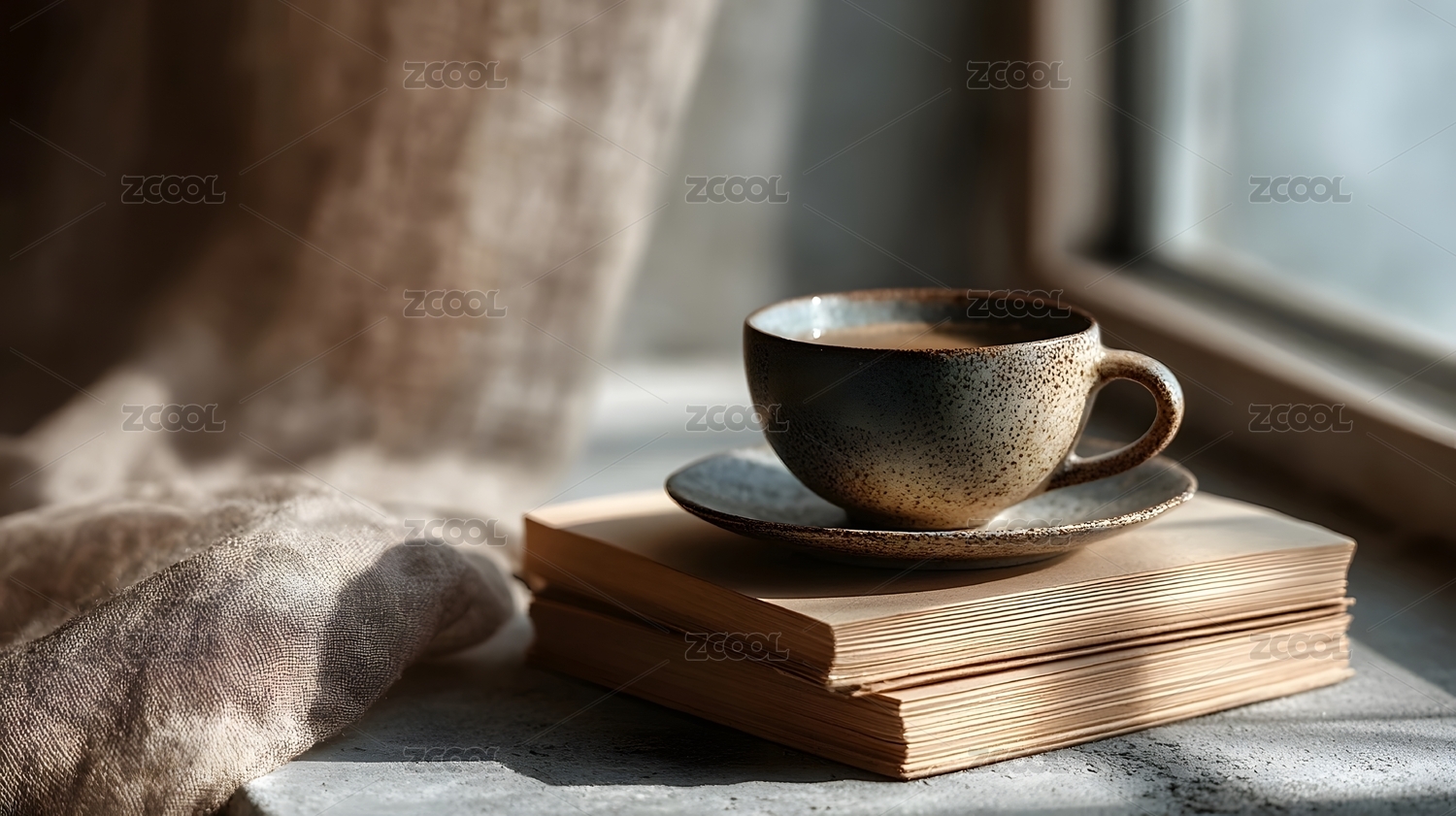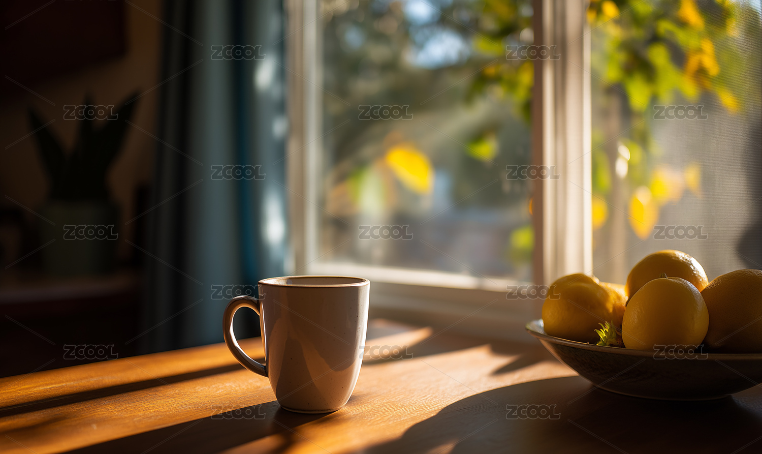 窗边桌上咖啡杯与柠檬的温馨光影场景