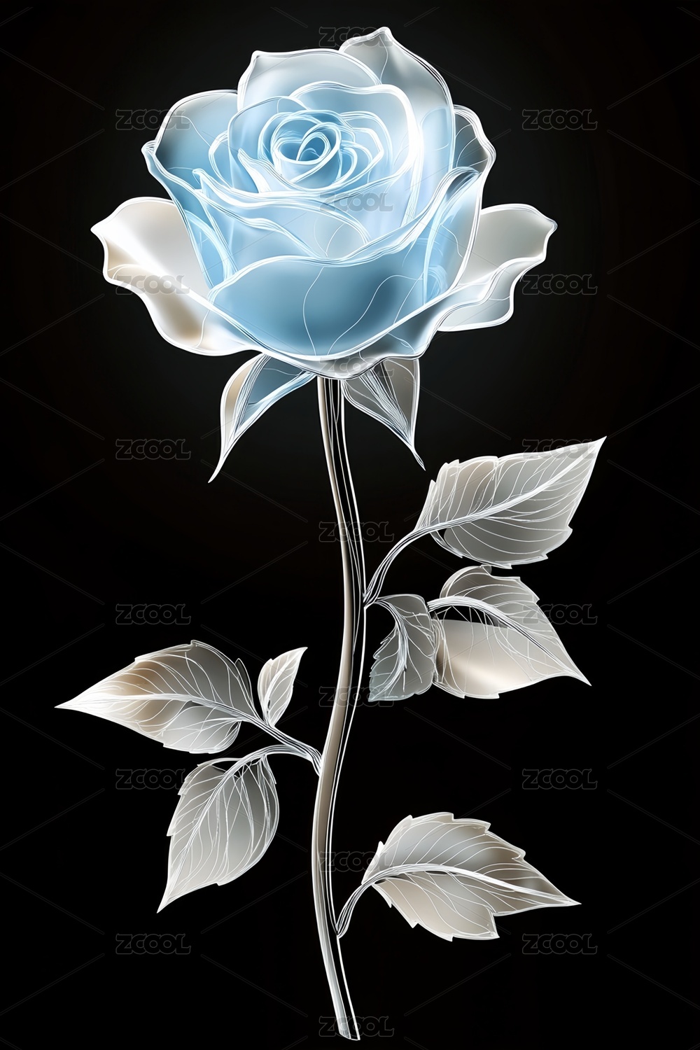 3D立体透明玻璃三维质感光感蓝玫瑰花
