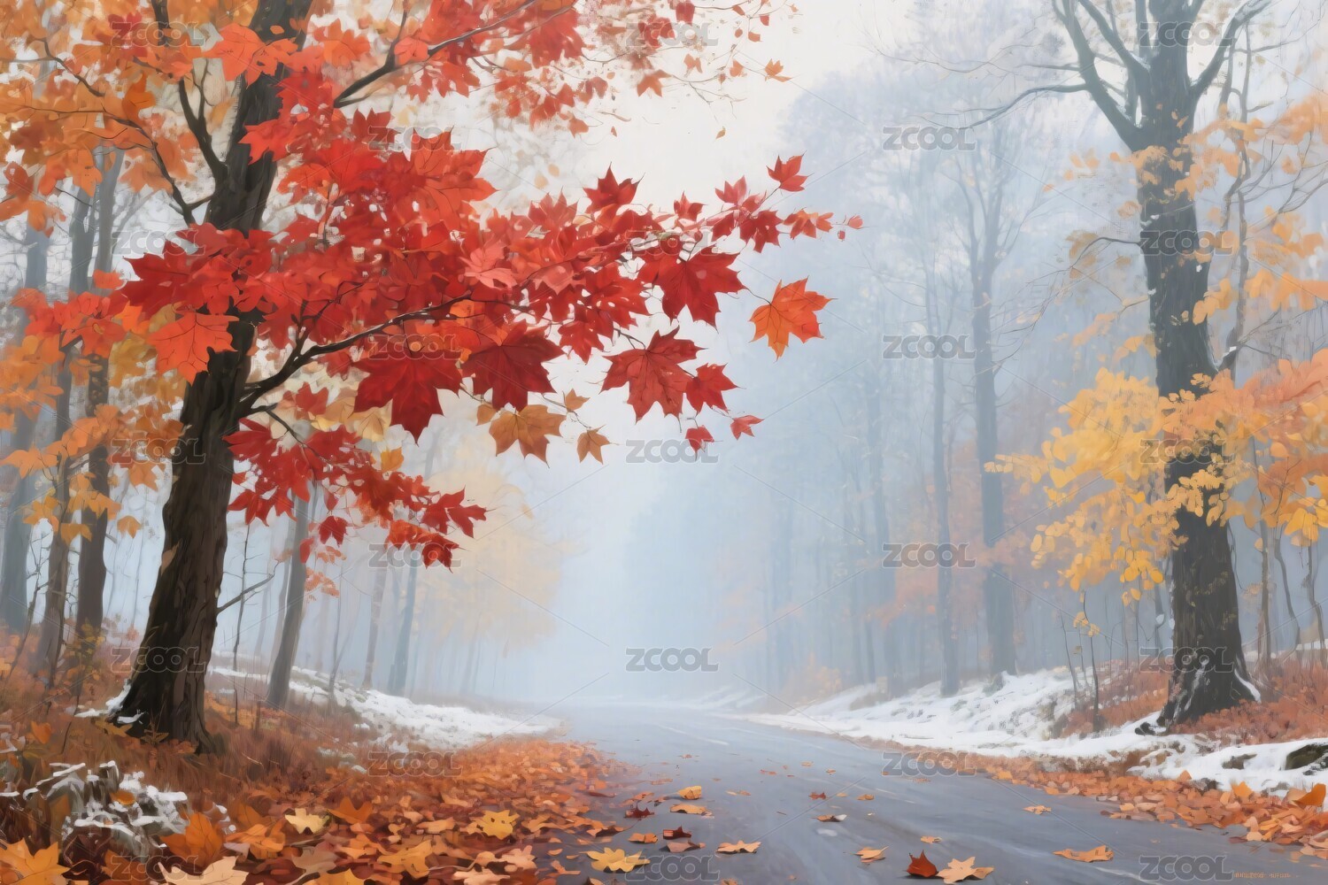 秋日雾中红叶林间道路