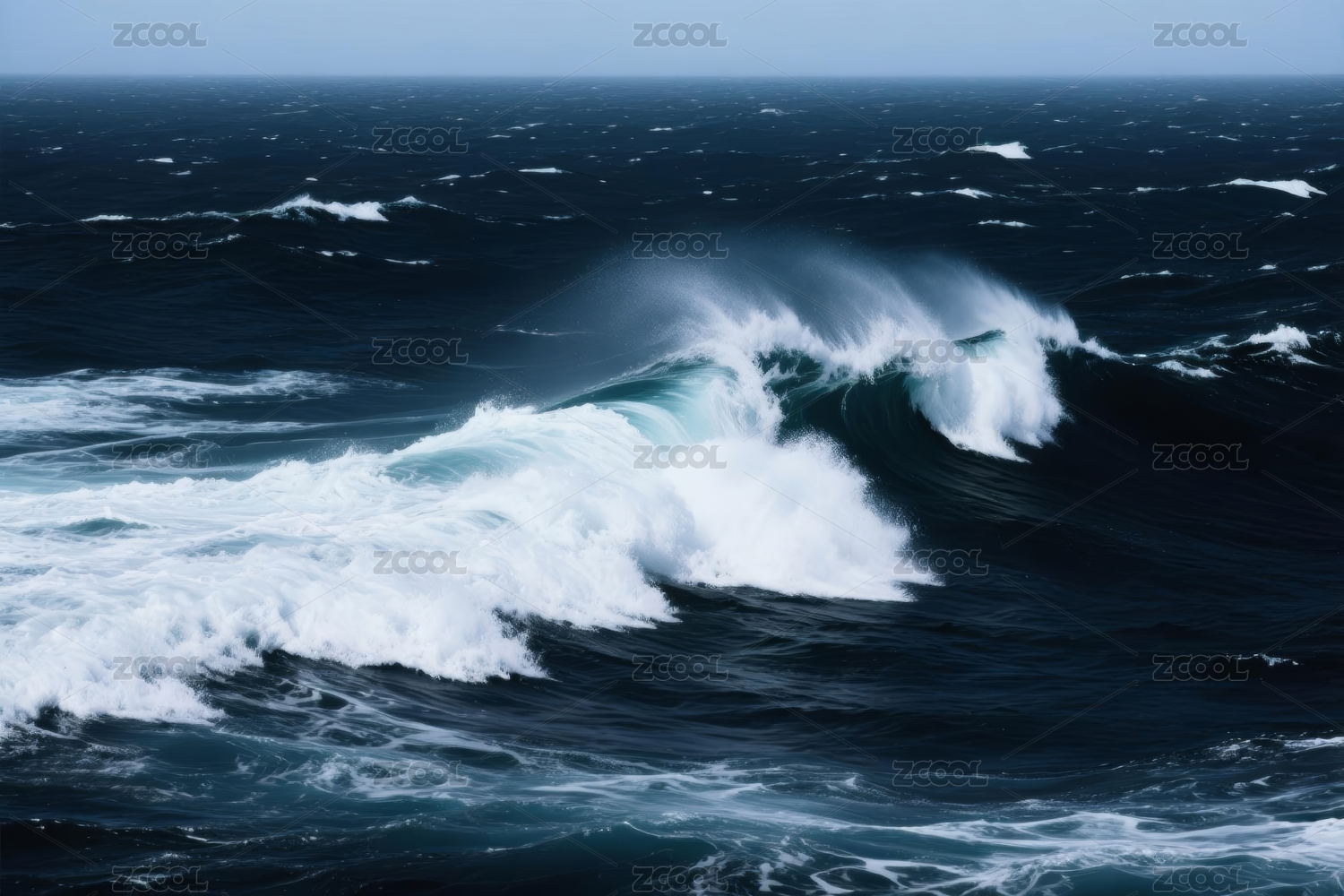 蓝天白云下一道壮观的海浪浪尖处水花飞溅