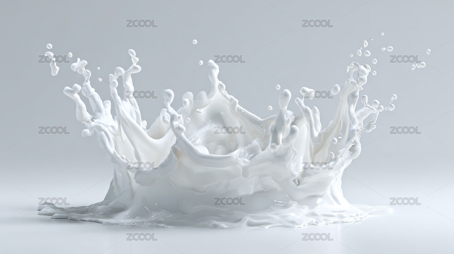 白色牛奶在灰色背景前飞溅 形成动态水花形