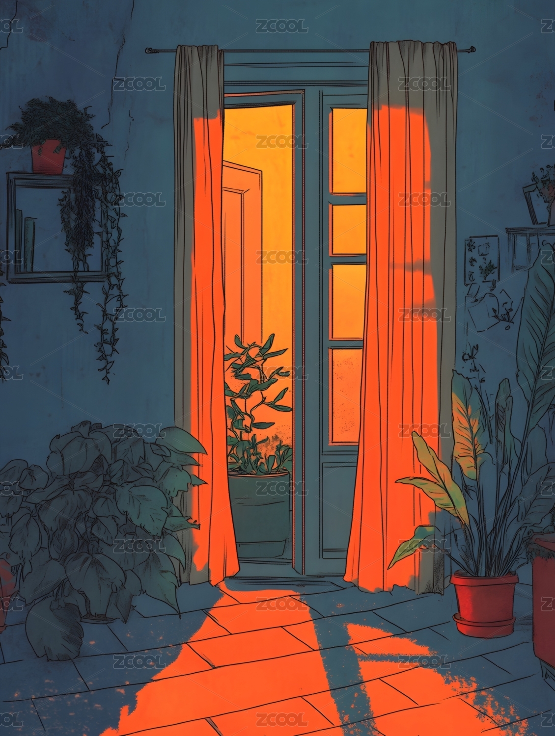 黄昏植物阳台卡通插画