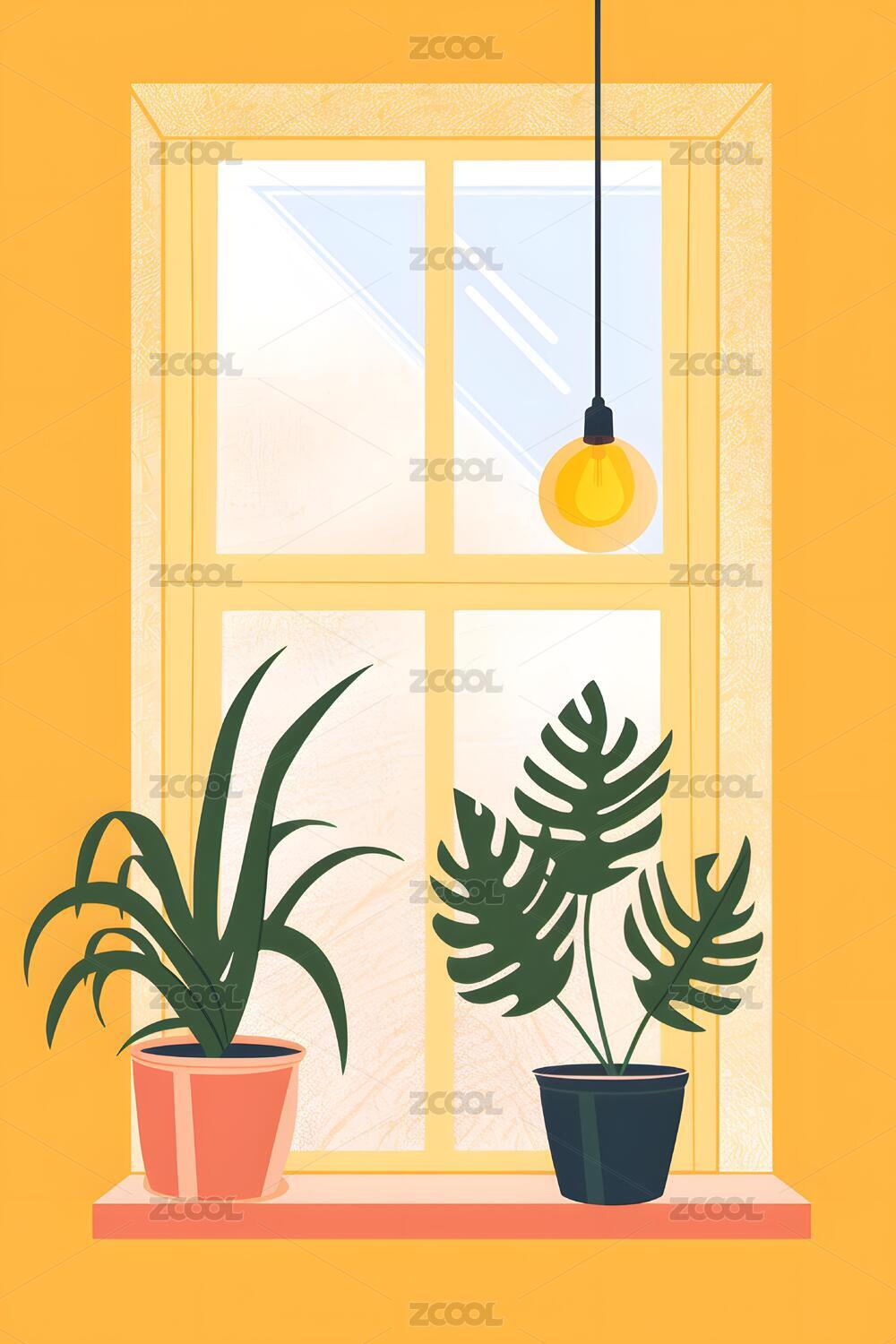 室内窗户植物与悬挂灯泡