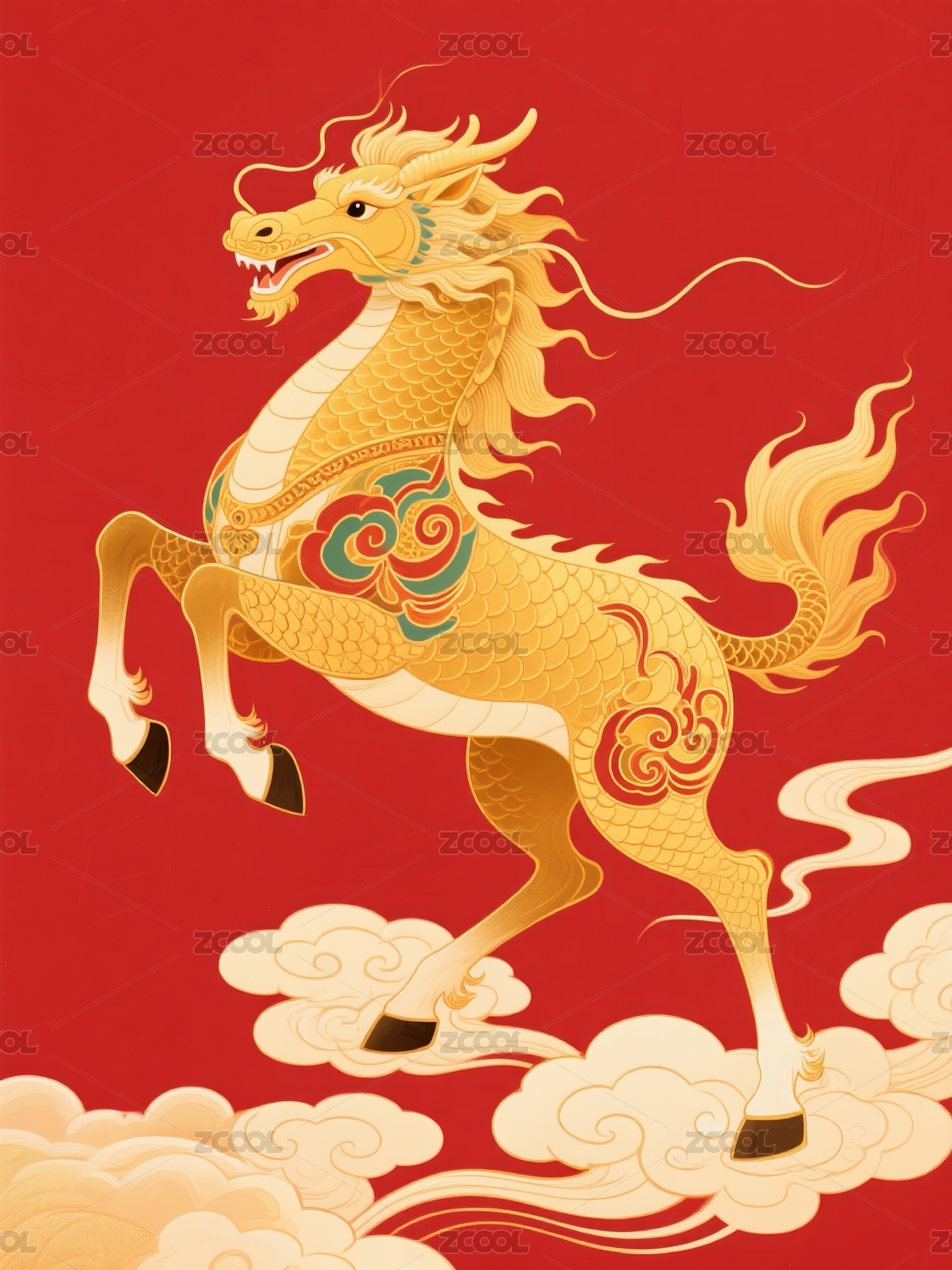 传统古典手绘麒麟神兽祥云矢量中国风年画