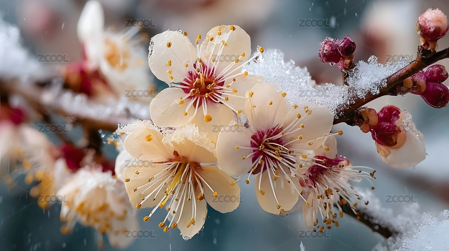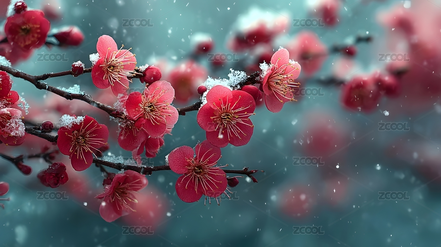 雪花红梅花开明亮梦幻背景优雅壁纸