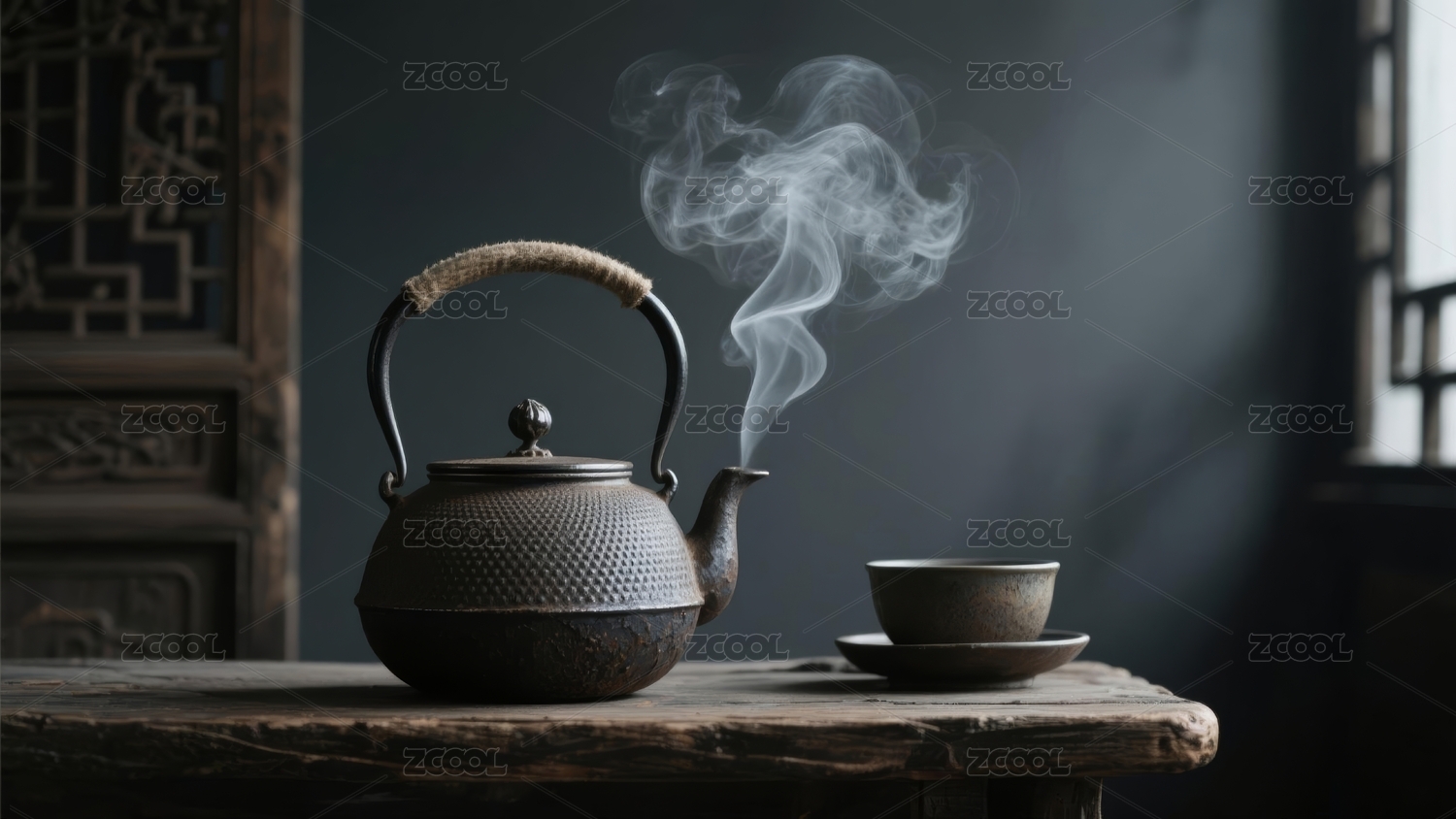陶瓷茶具和袅袅飘散的沉香烟雾