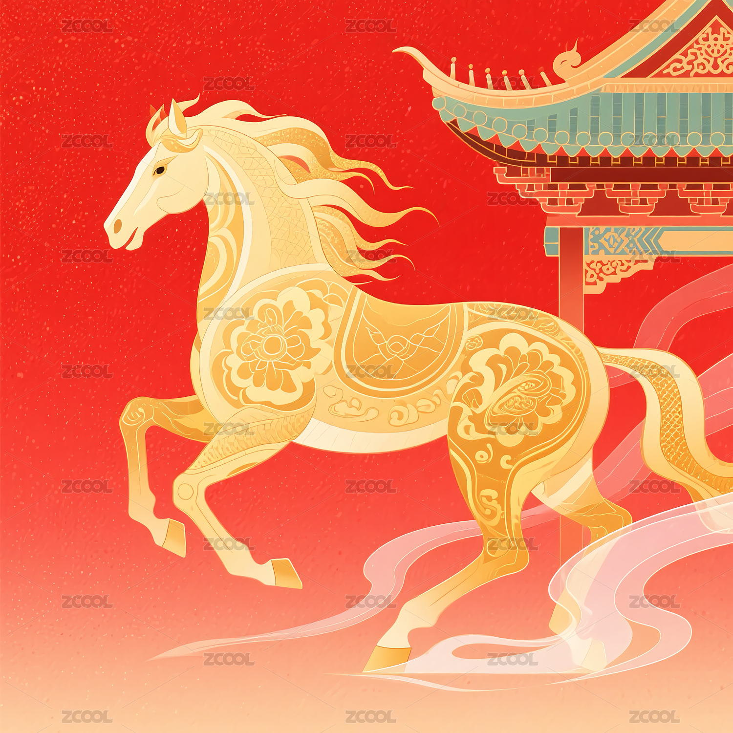 新年,马年,背景,装饰画,壁纸,古建筑,国潮,鎏金,节日,12生肖