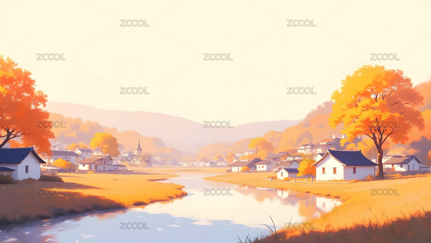 金色田野蜿蜒河流与蓝色屋顶农舍