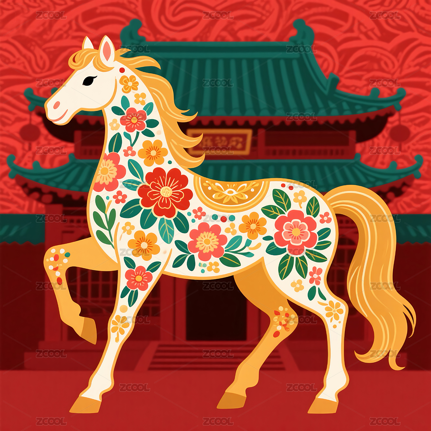 新年,马年,背景,装饰画,壁纸,古建筑,国潮,鎏金,节日,12生肖