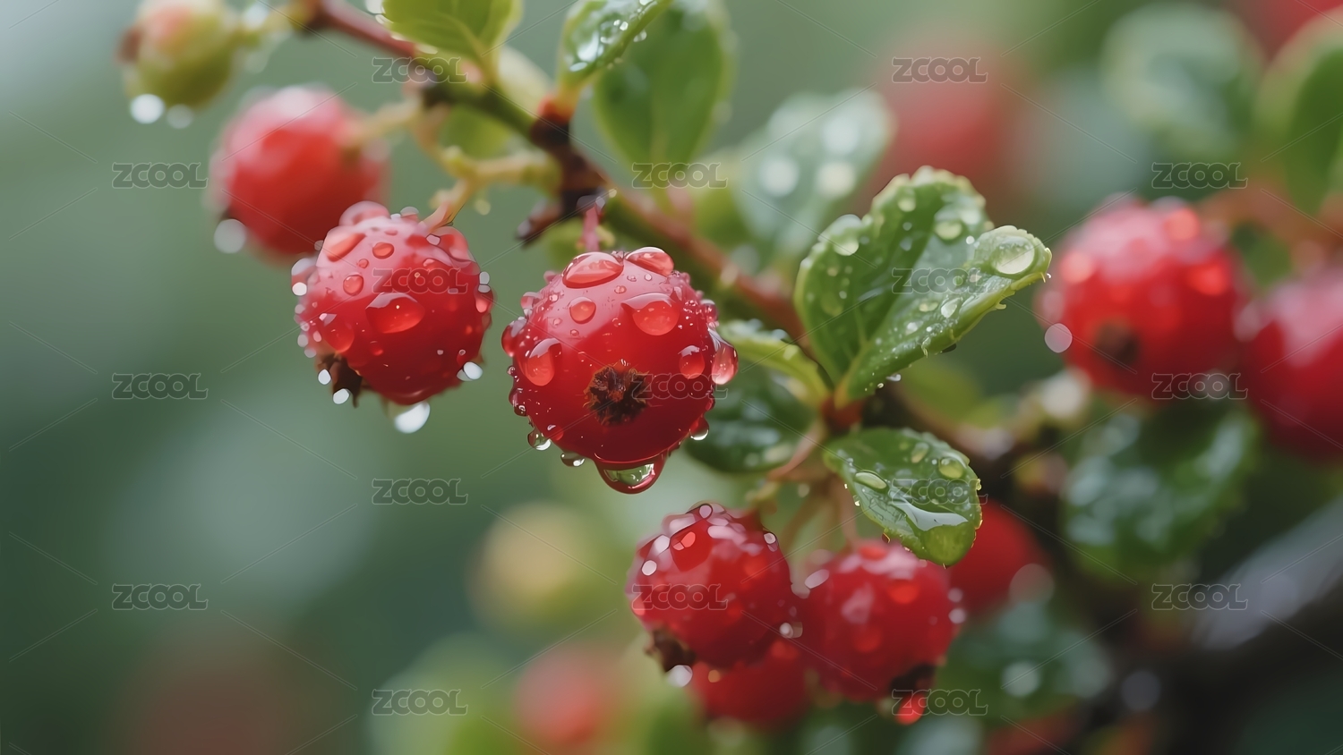 特写,自然,水滴,清新,绿叶,果实,鲜红,枝头,雨后