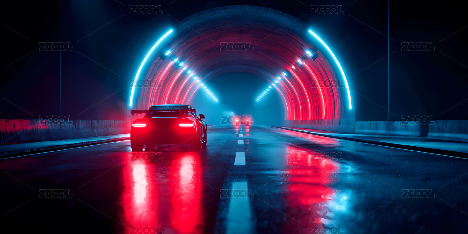 未来科技感十足的汽车在霓虹灯隧道中行驶