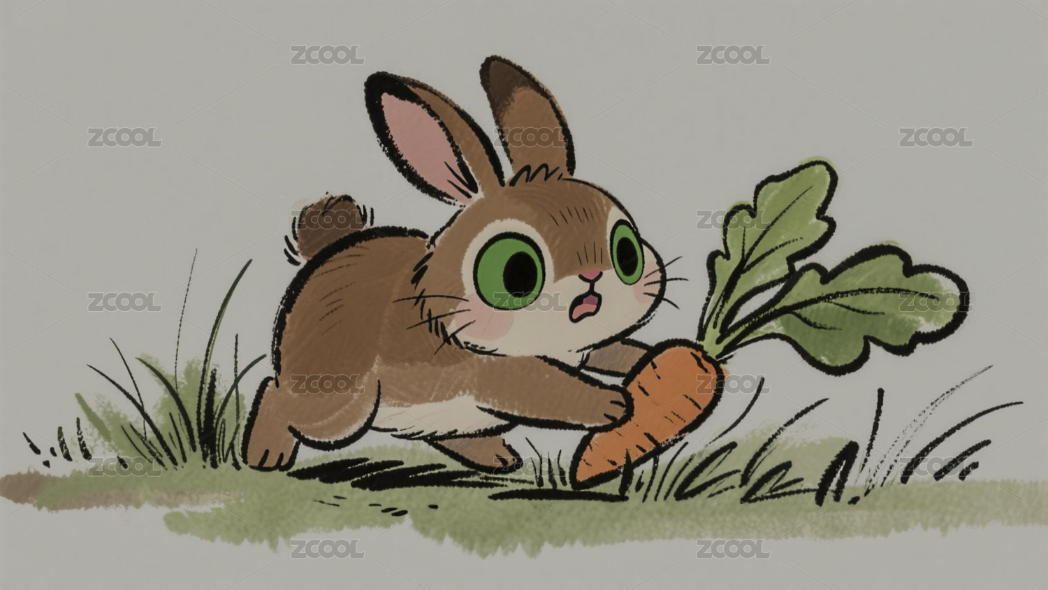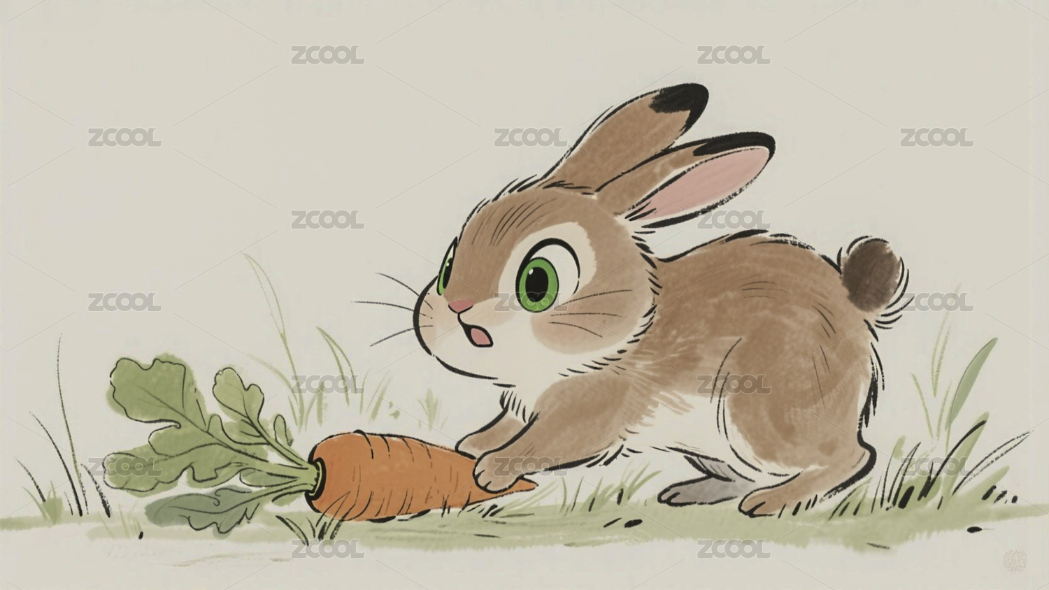 插画手绘小兔子拔萝卜水墨风格场景