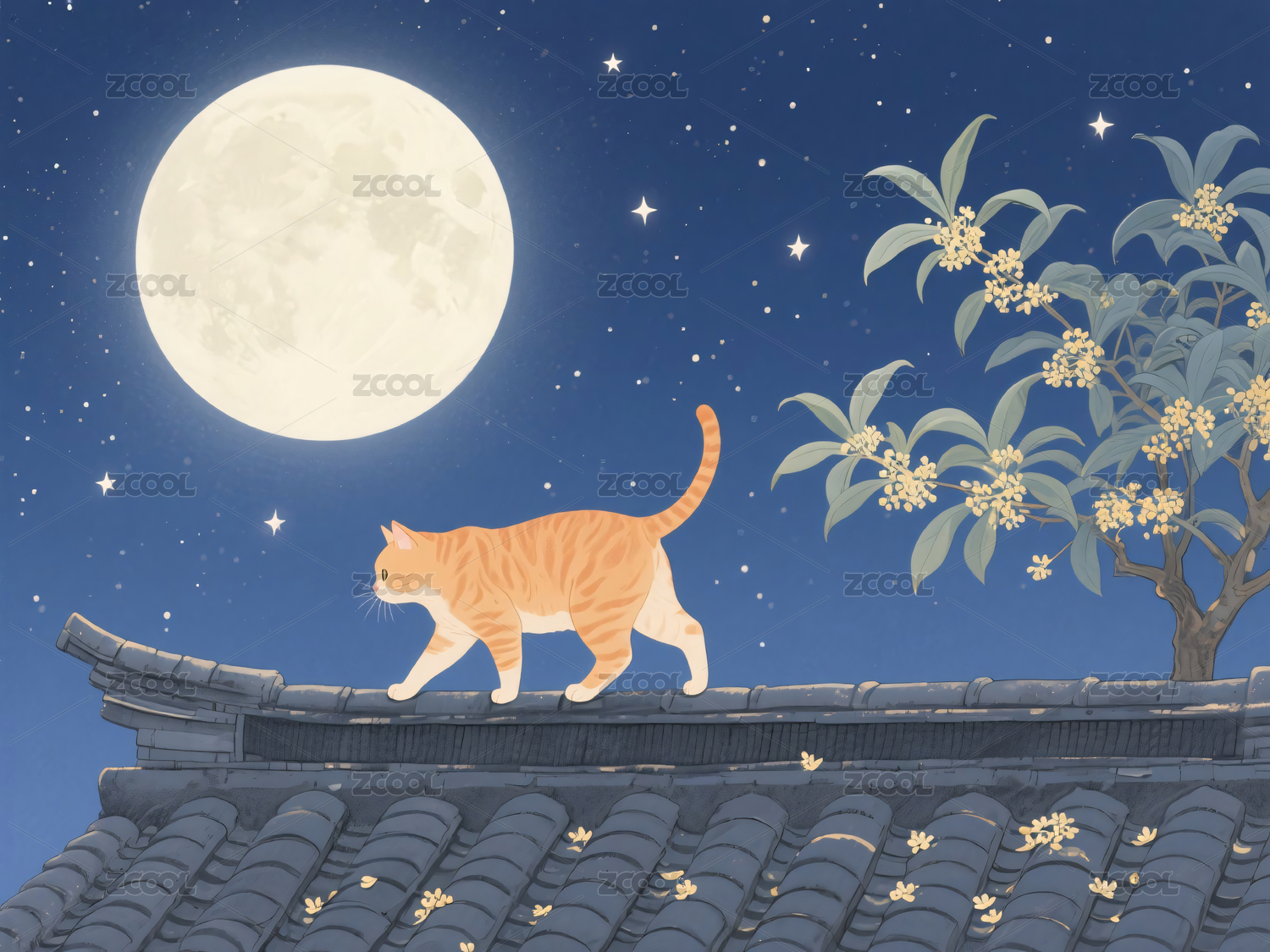 月亮,夜晚,桂花,中秋,橘猫,插画
