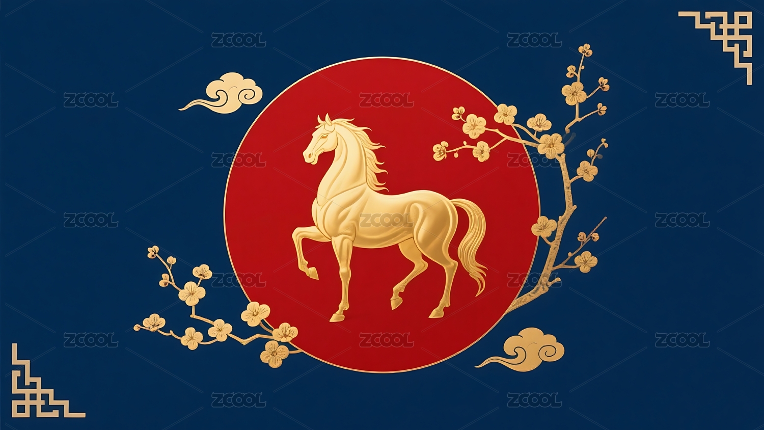 祥瑞金马蓝环花饰簇拥的节庆图景