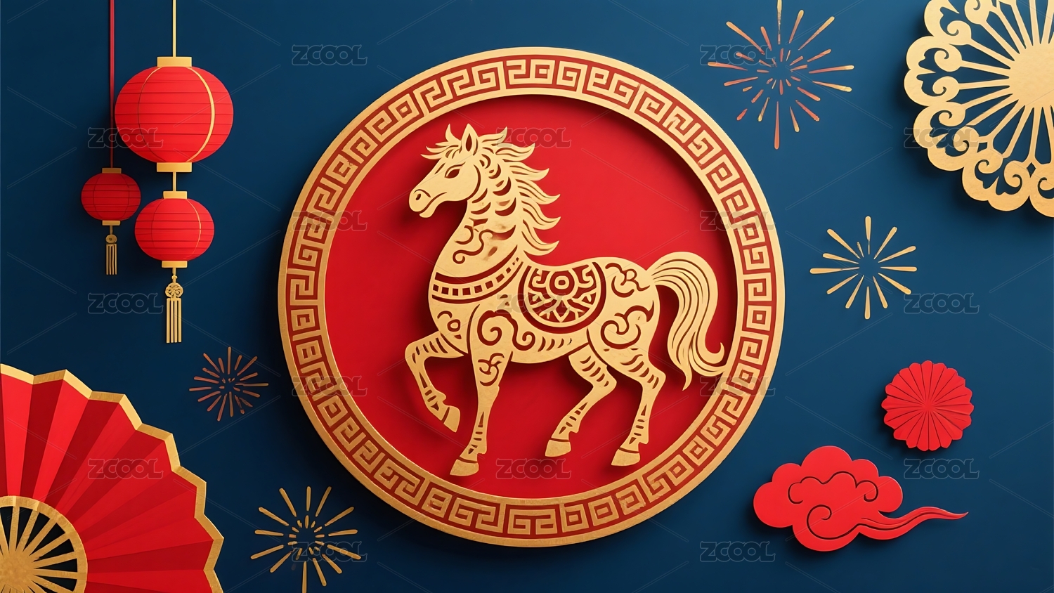 金色骏马与传统灯笼装饰