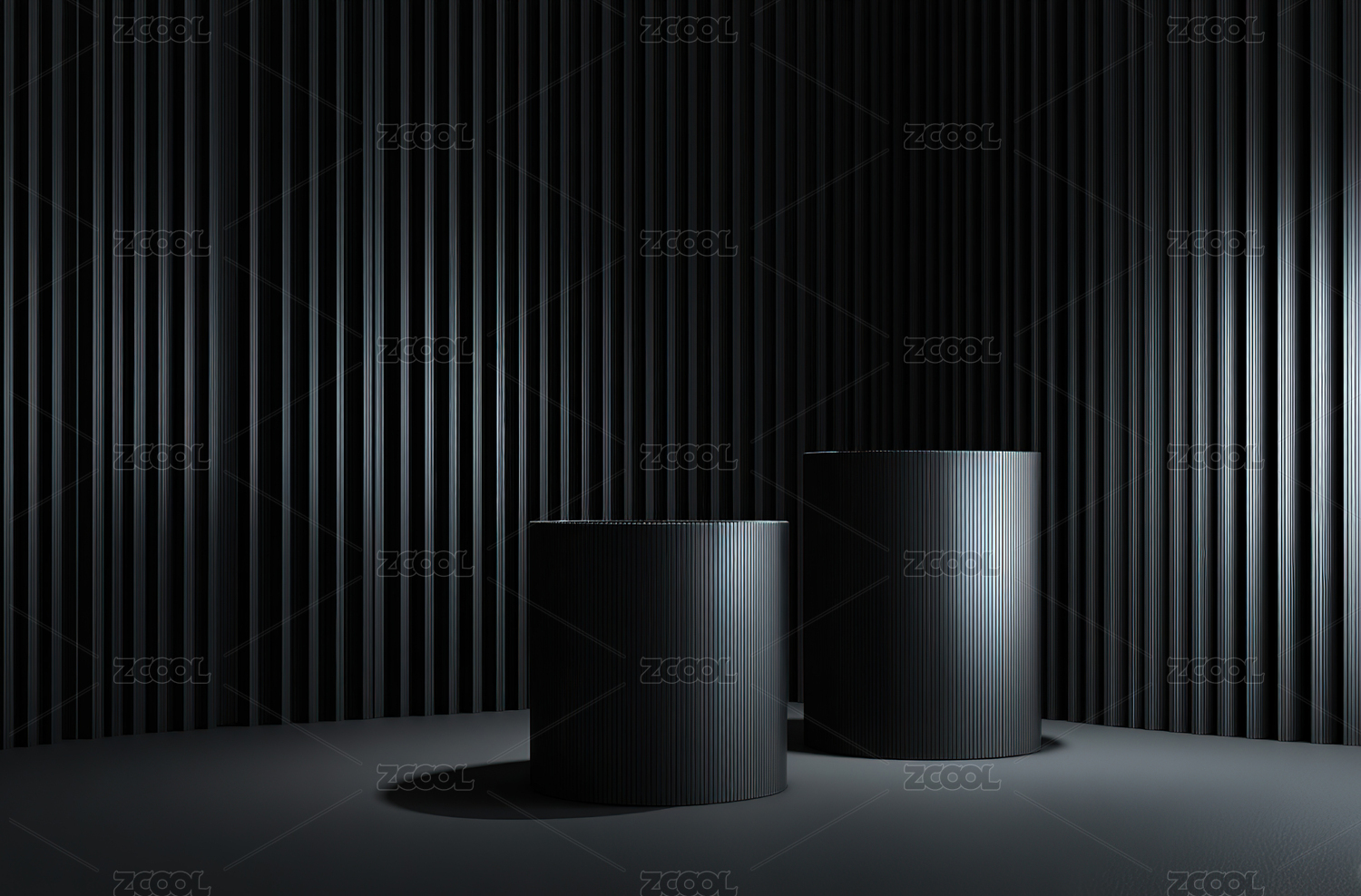 简约黑色圆柱与流动丝带的抽象艺术构图
