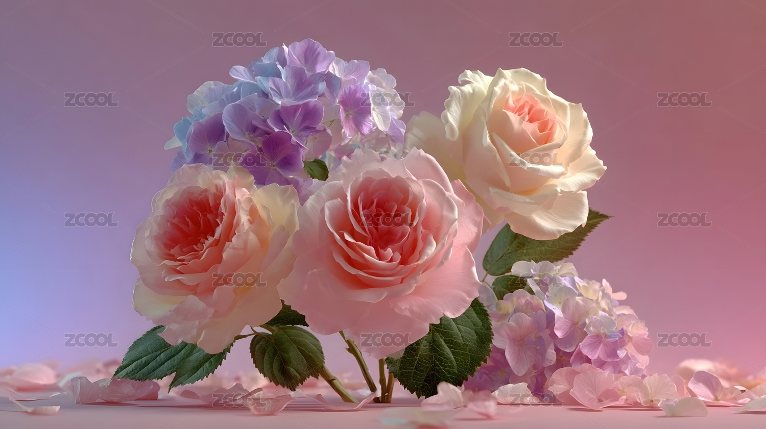 粉色玫瑰与绣球花组合