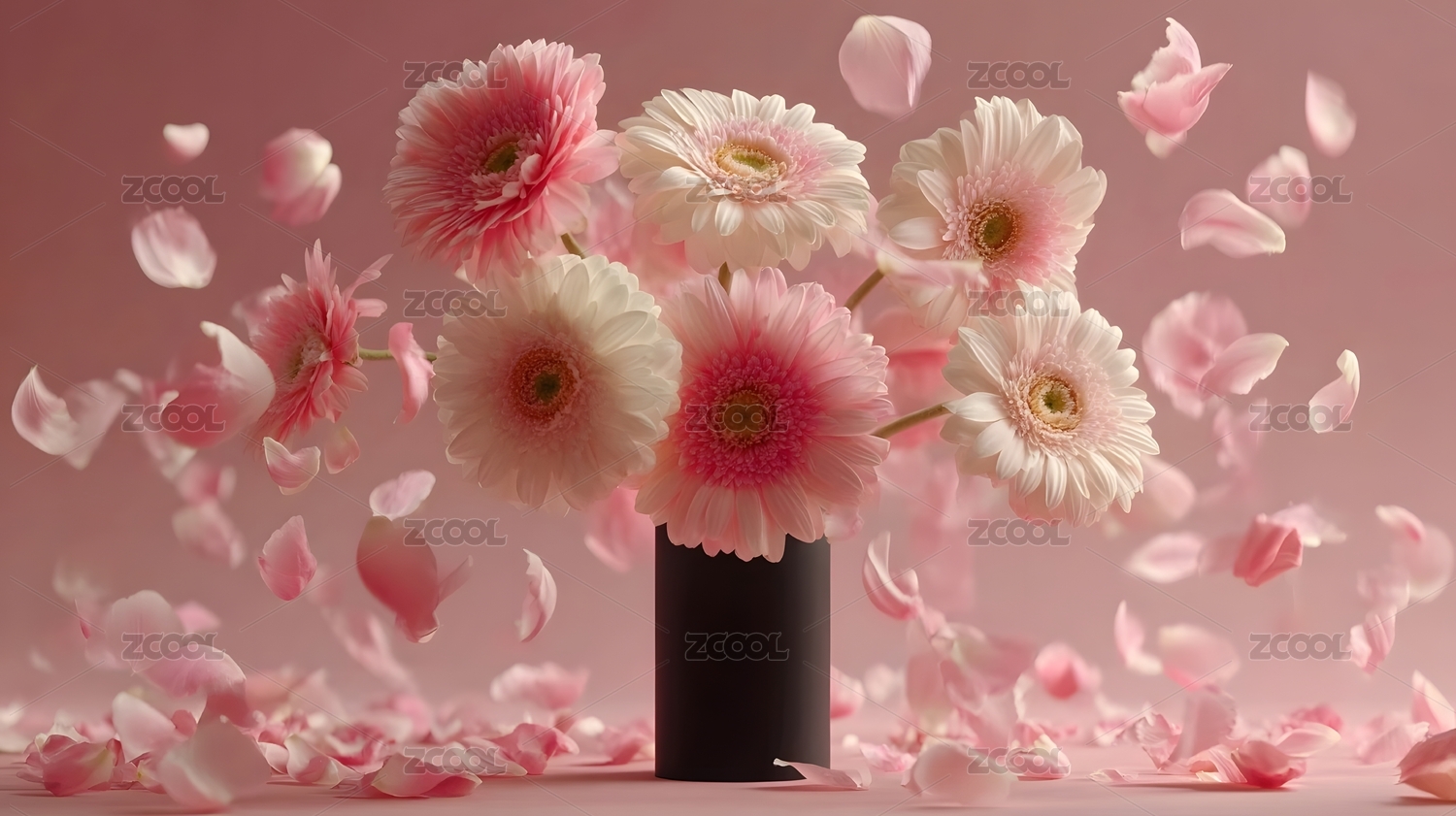 粉色雏菊花束与飞舞花瓣