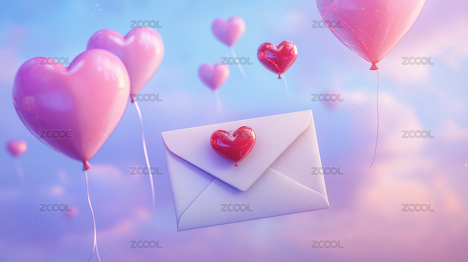 漂浮的信封和爱心气球