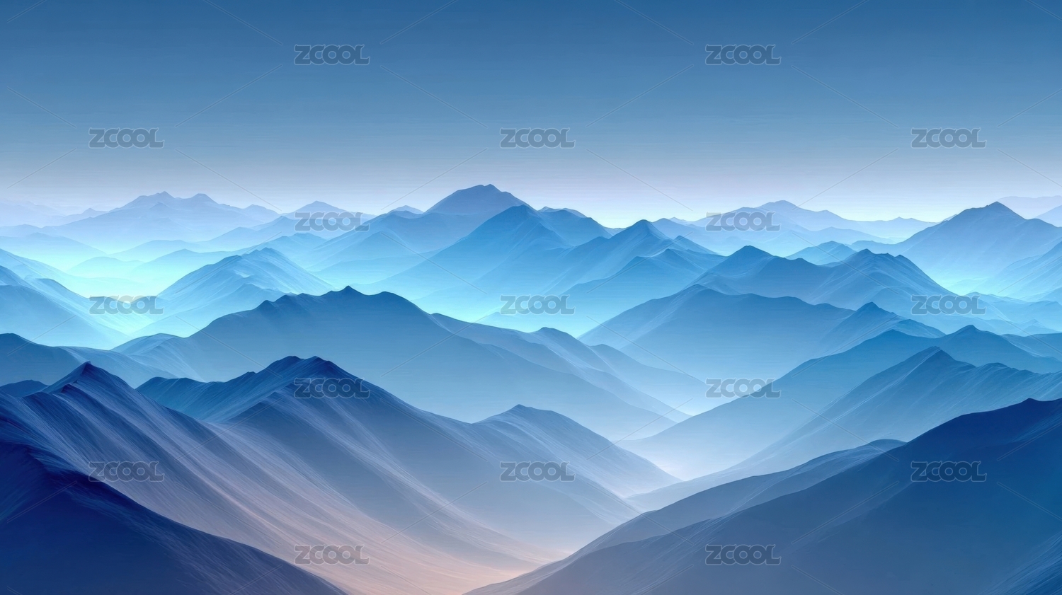 淡蓝背景下群山层叠朦胧展现诗意水墨山水意
