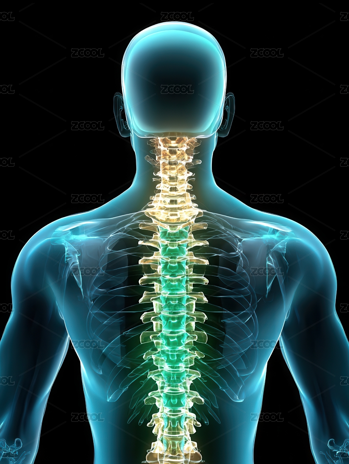 蓝色虚拟人体模型的橙色脊柱处有突出显示