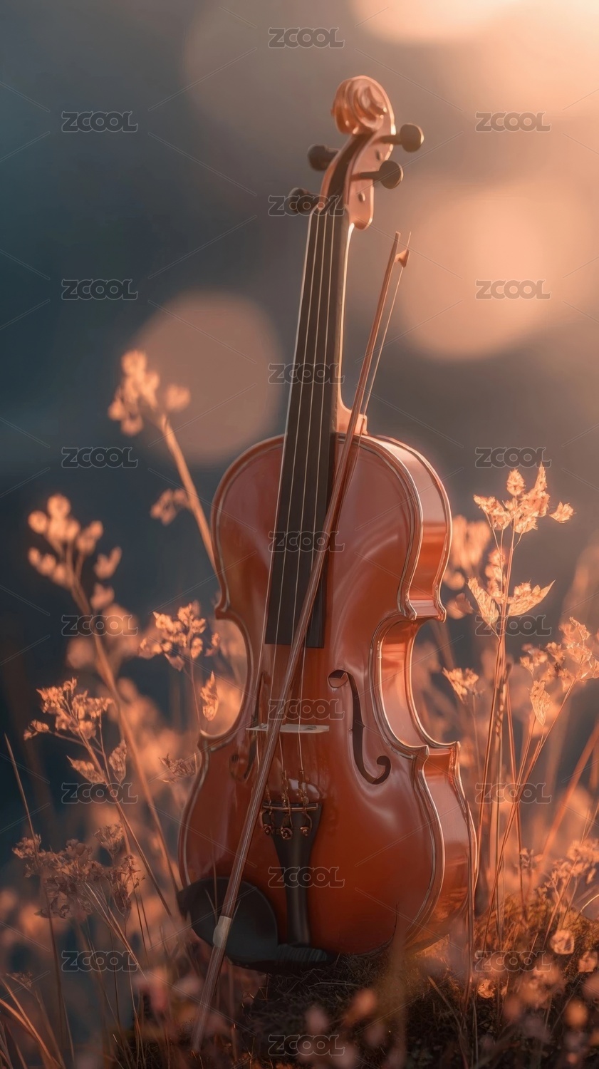 夕阳光影下草地上放置的一把小提琴一盆花和一撂书本