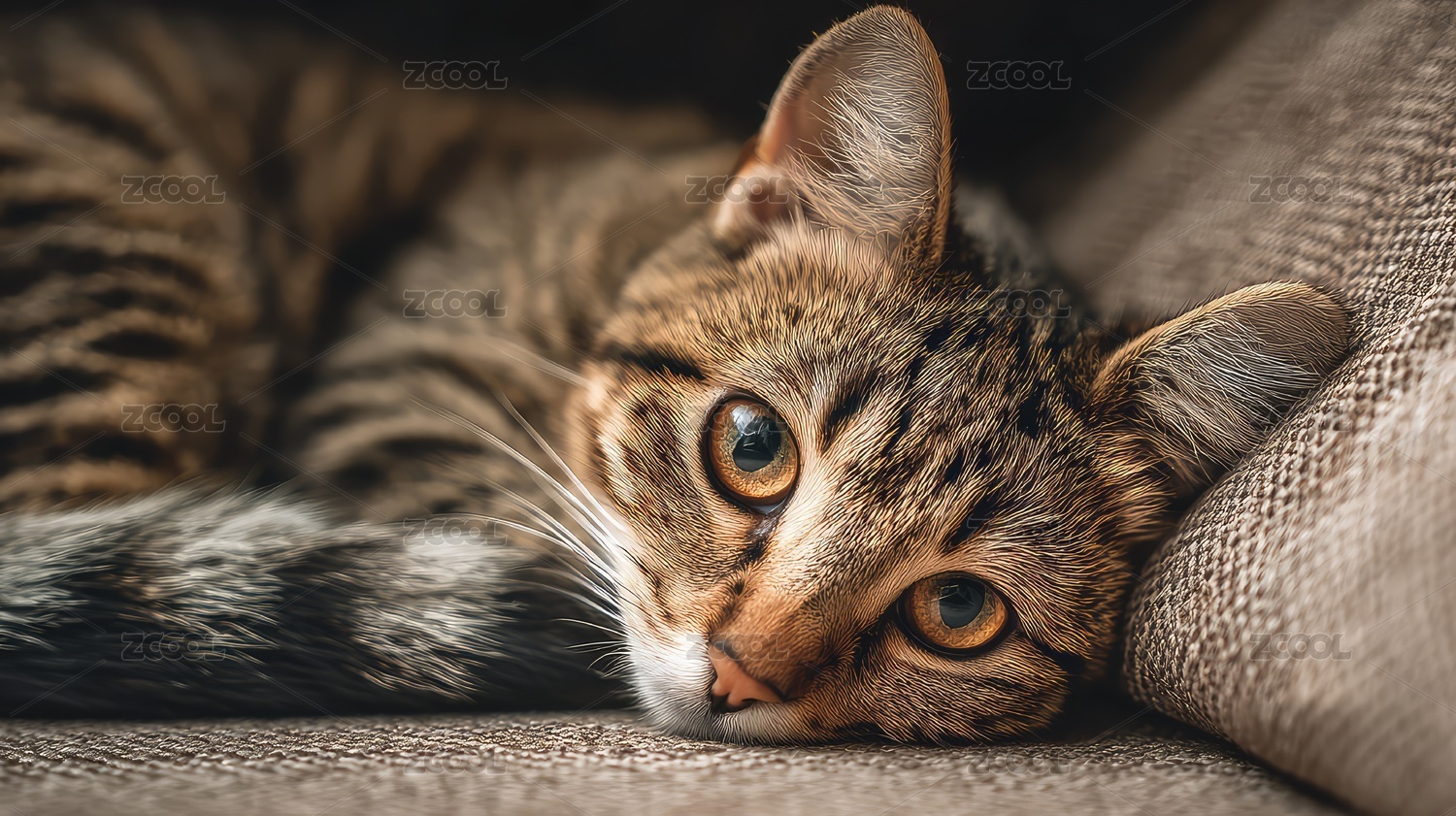 可爱的虎斑猫蜷缩在中性色调的软垫上