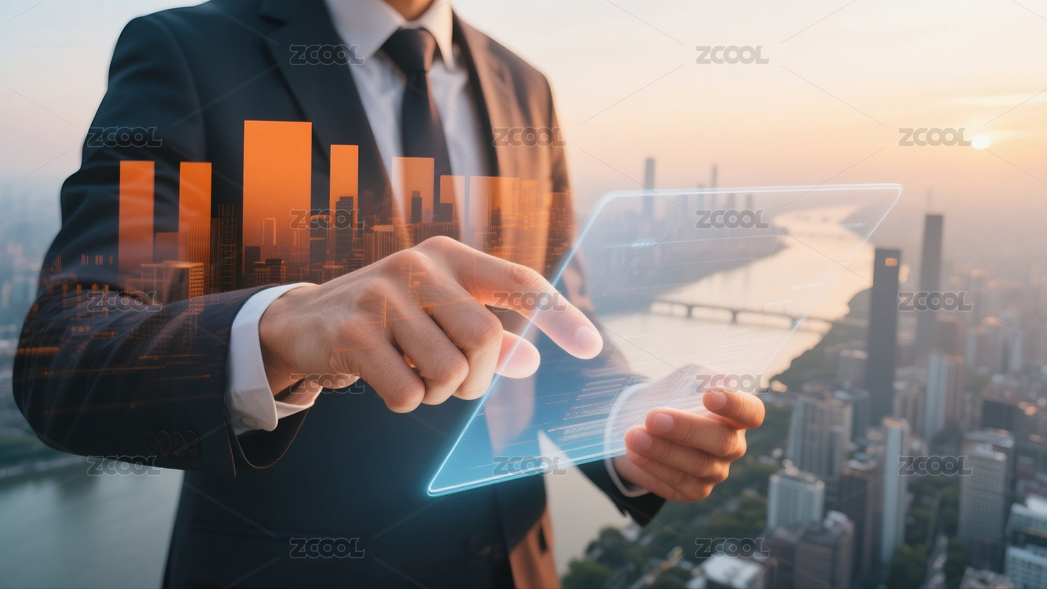 金融商务人士手拿着笔穿着正装西服城市双重曝光概念