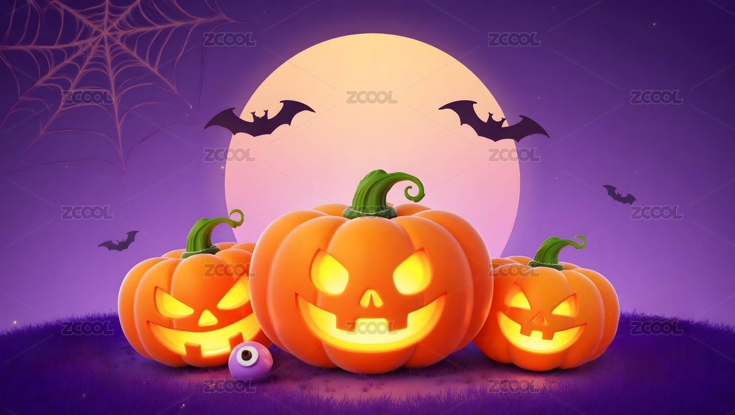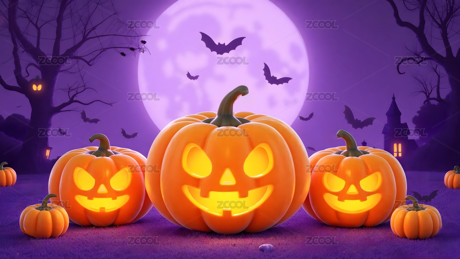 南瓜灯照亮紫色月夜万圣节场景