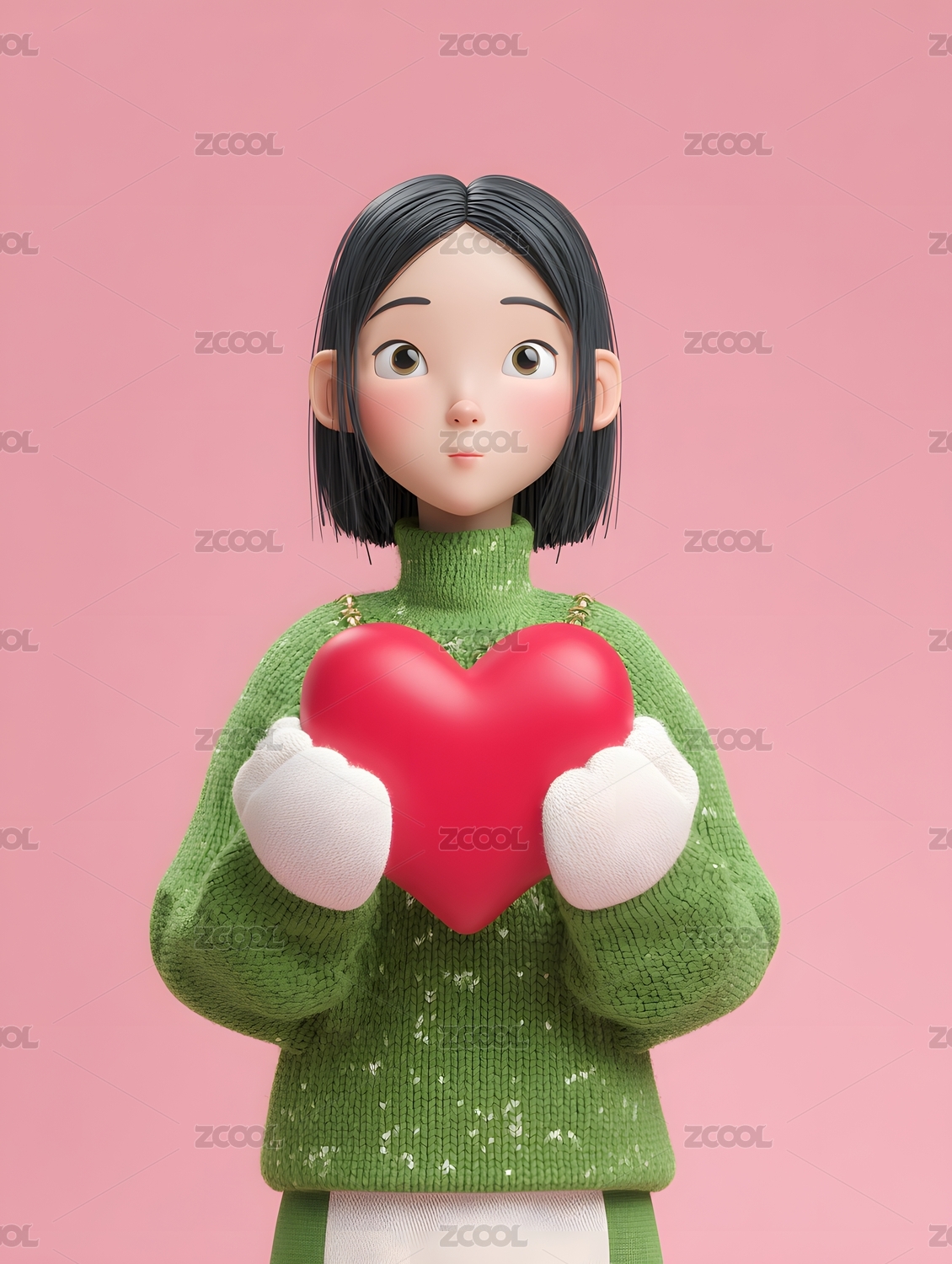 人物,3D,立体,可爱,插画,爱心,绿色,毛衣,卡通,温暖