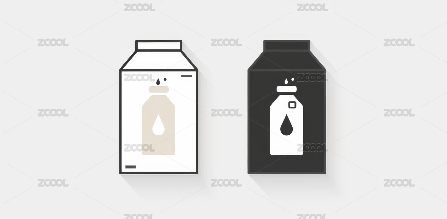 黑白牛奶盒矢量图标与水滴变化