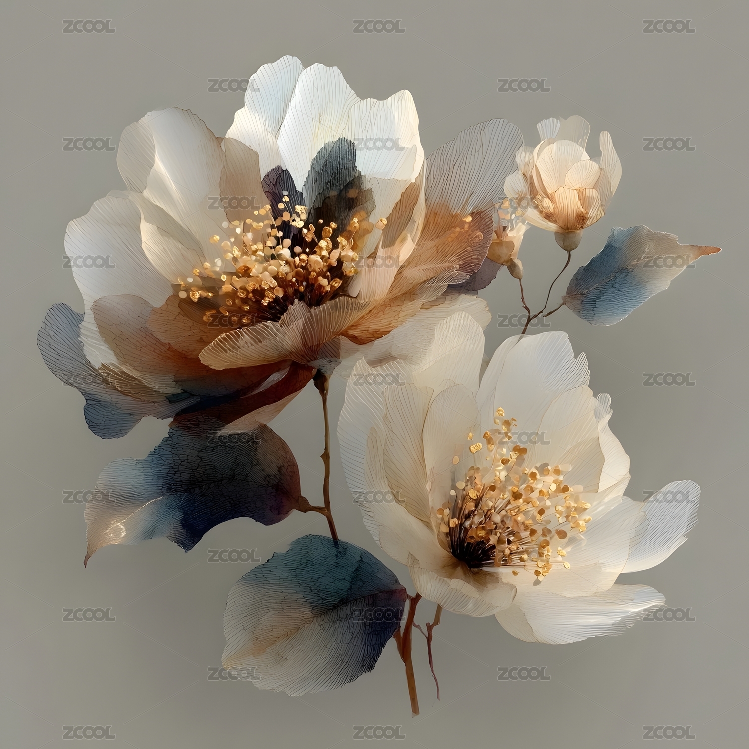 精美艺术风格的浅蓝色牡丹