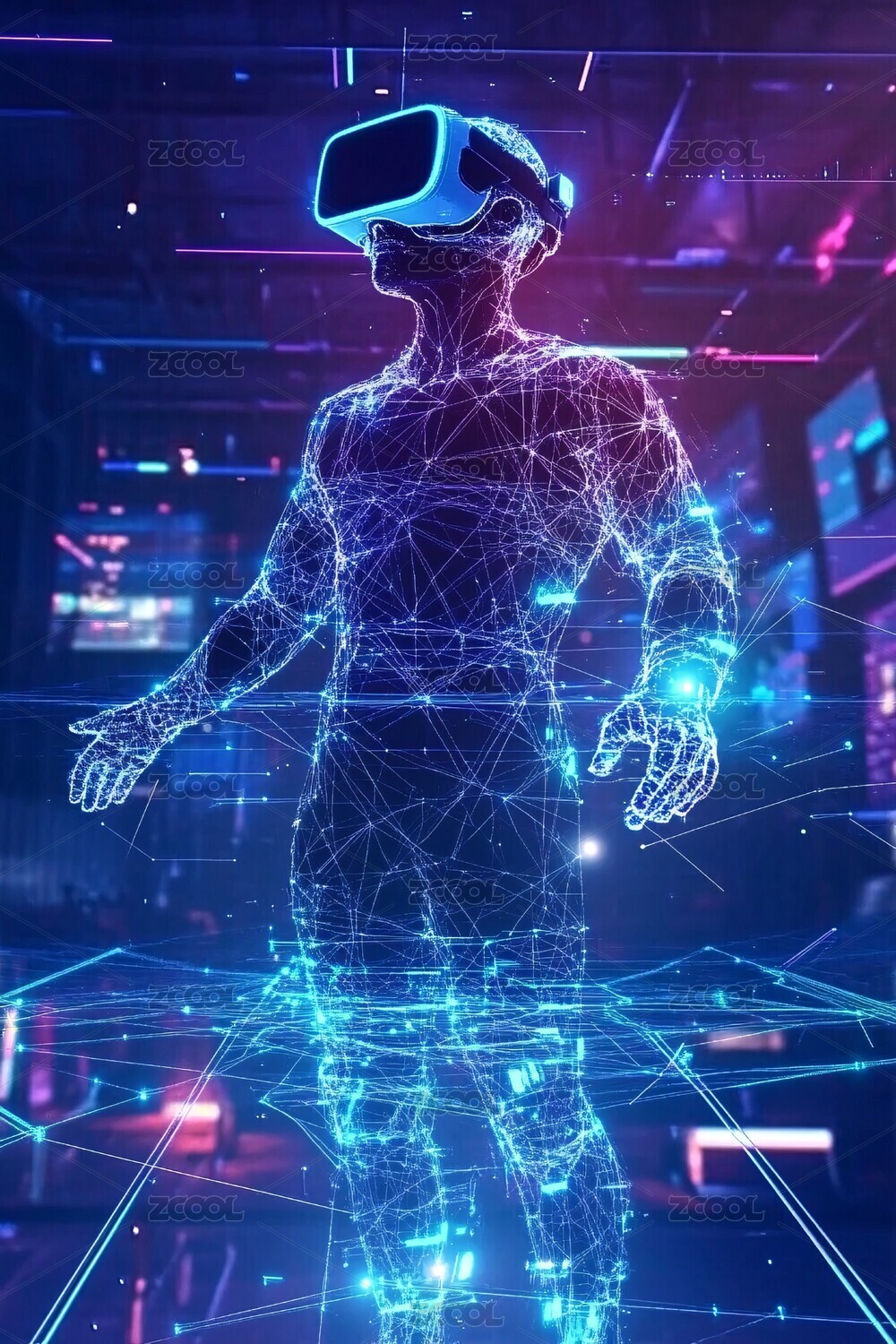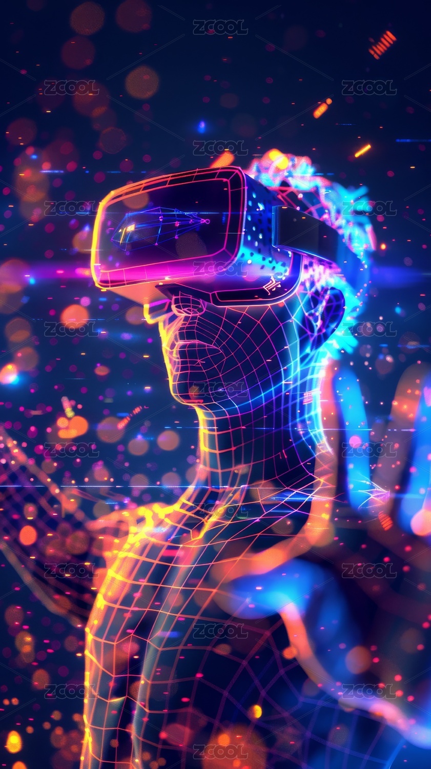 虚拟人物,VR眼镜,科技感,未来感,光影,插画,人物,耳机,网格,酷炫