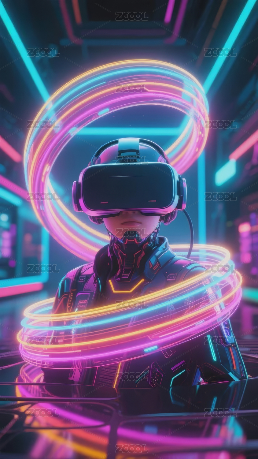 赛博朋克风头戴VR眼镜的女生