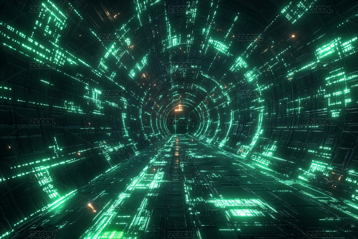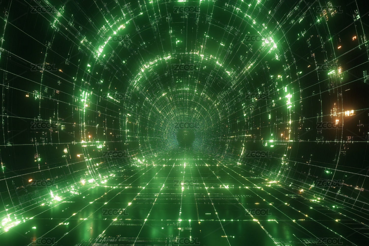 数码隧道,绿色光,科技元素,插画,未来感,虚拟,空间,线条,光影,数码
