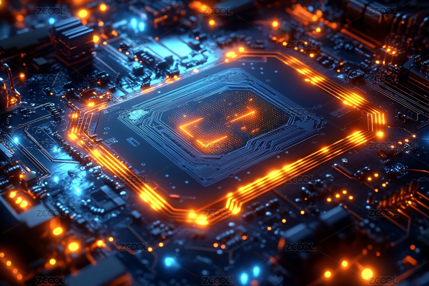 芯片,电路板,科技,数码,未来感,插画,电子元件,电路,蓝色,橙色