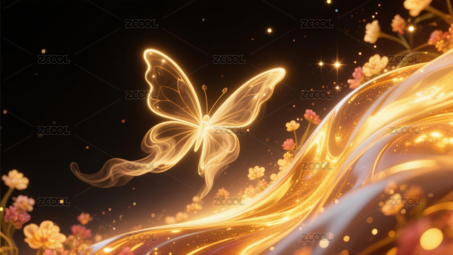金色蝴蝶翩翩起舞周围环绕着光芒与花朵