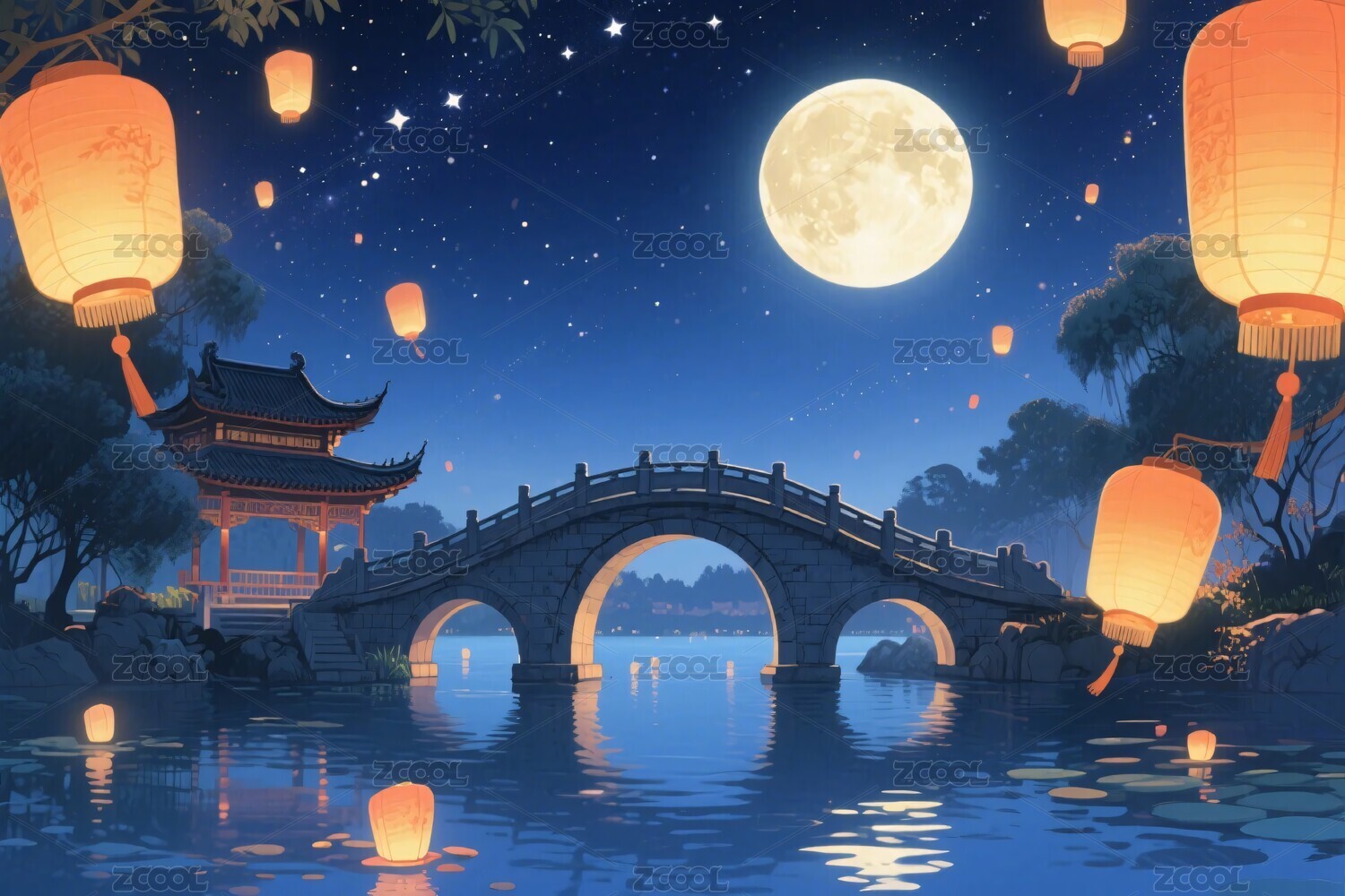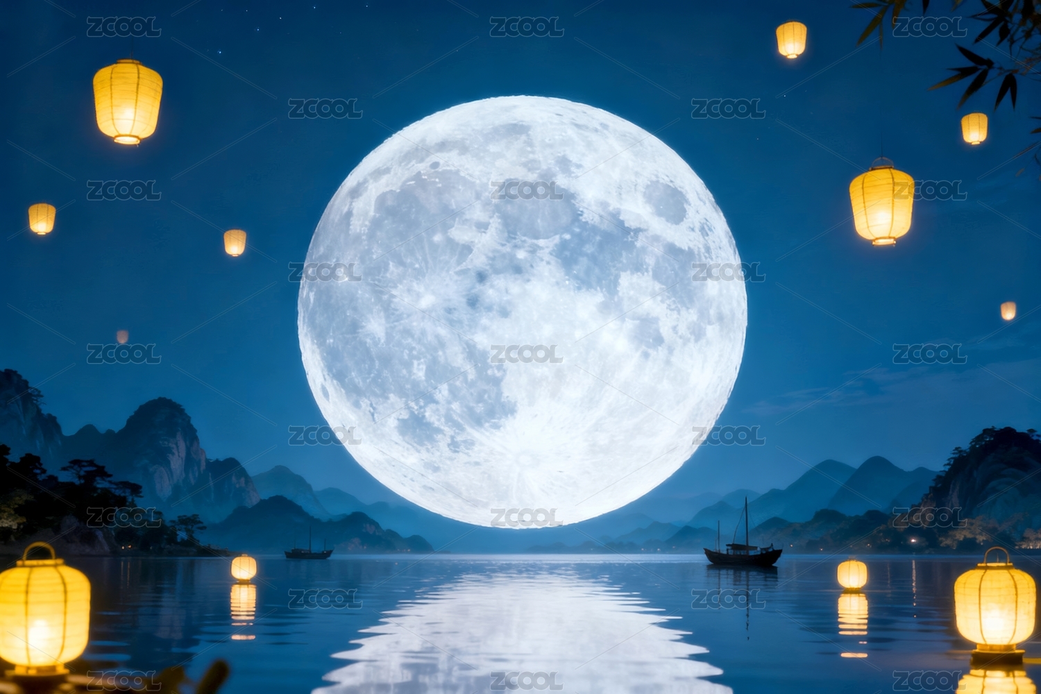 主视觉,商业,壁纸,古风,场景,唯美,月夜,河景,孔明灯,圆月