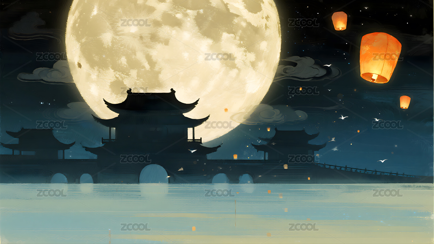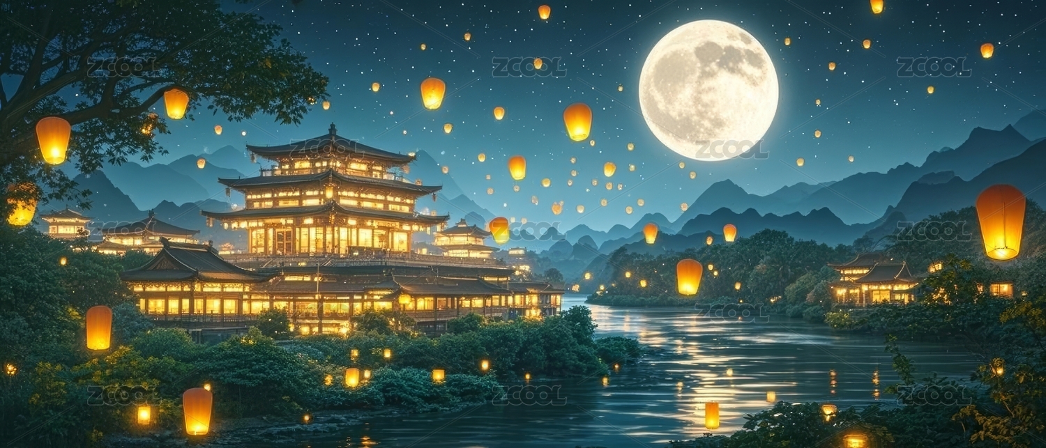 主视觉,商业,壁纸,古风,场景,唯美,月夜,河景,孔明灯,圆月