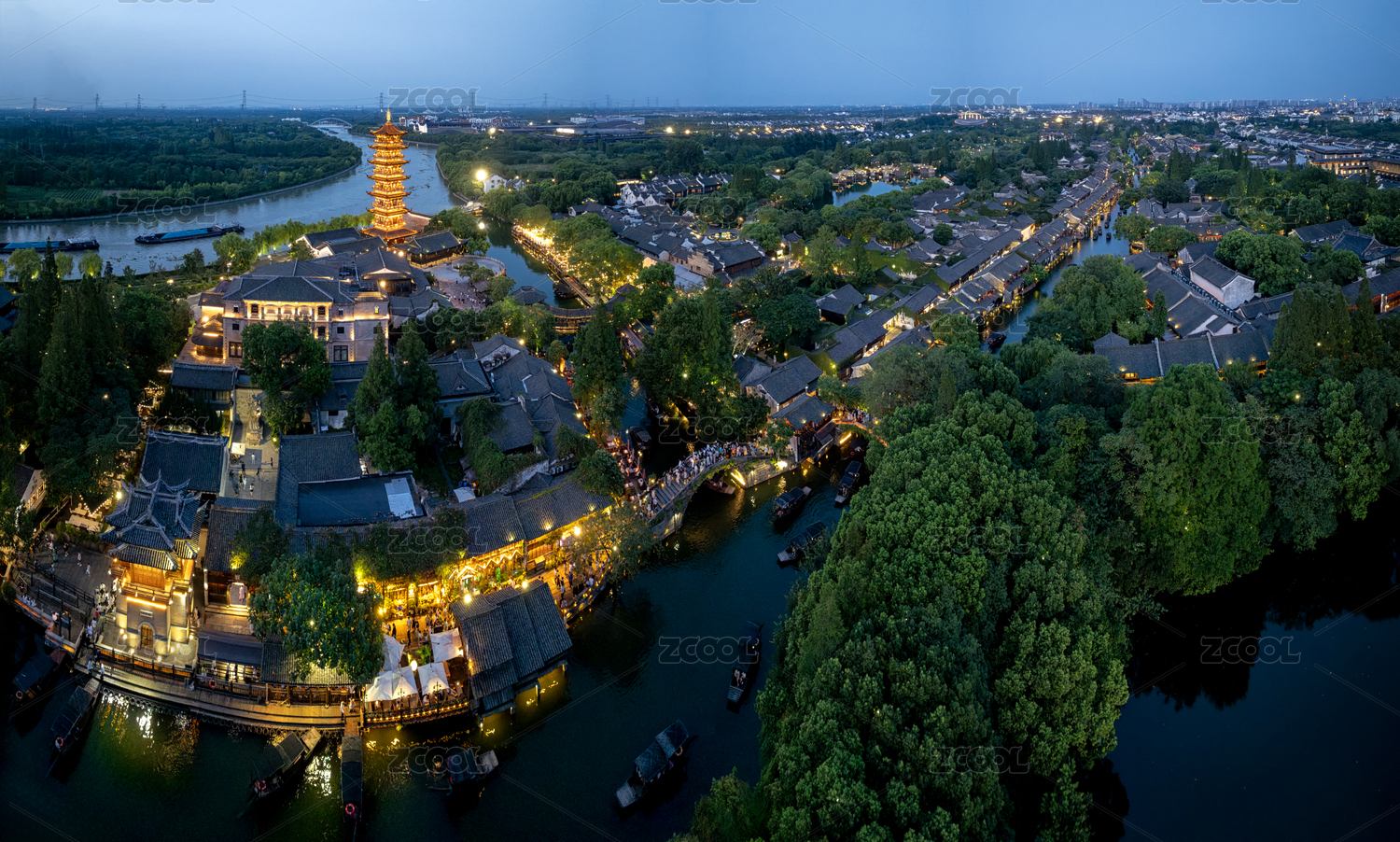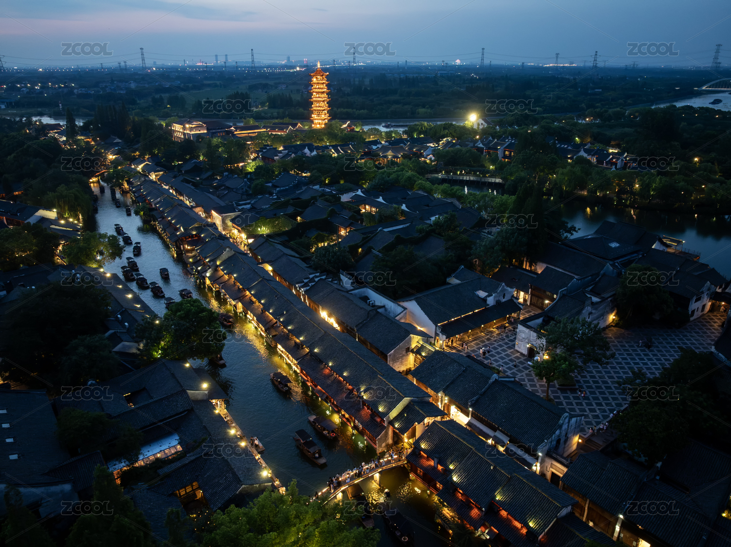 浙江嘉兴桐乡乌镇西栅景区江南水乡航拍夜景