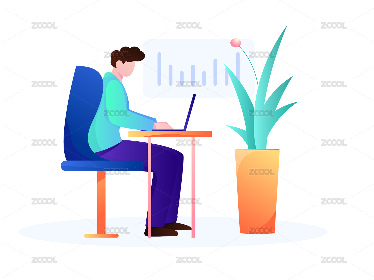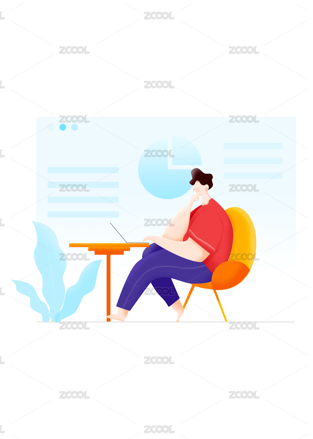 坐在有飘窗的房间的办公桌前 使用电脑办公聊天的穿着休闲服装的男人矢量海报插画背景