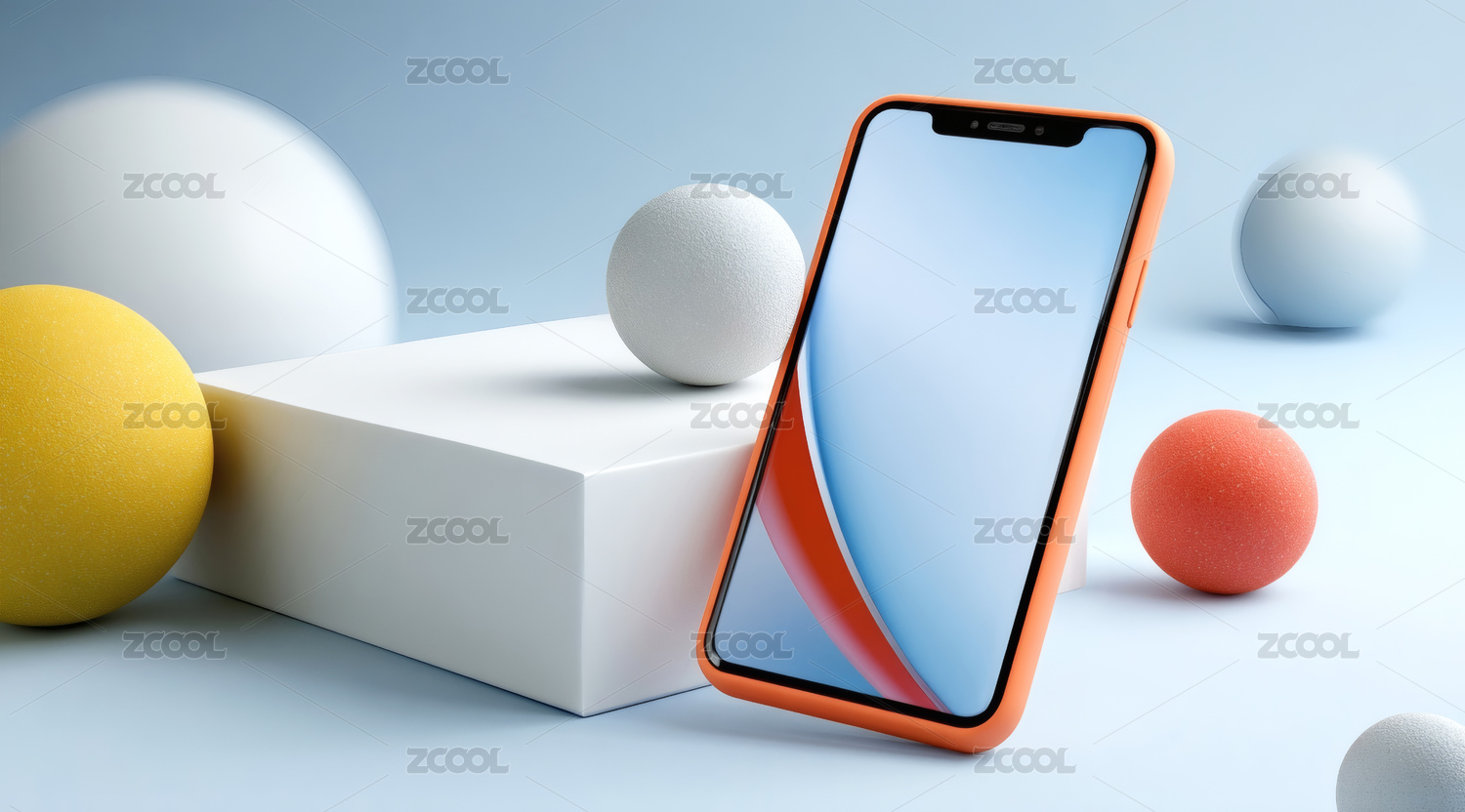 彩色气球和智能手机模型在蓝色和黄色背景上