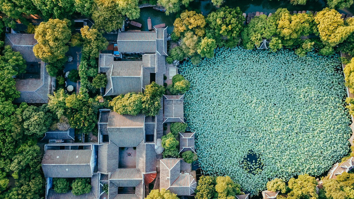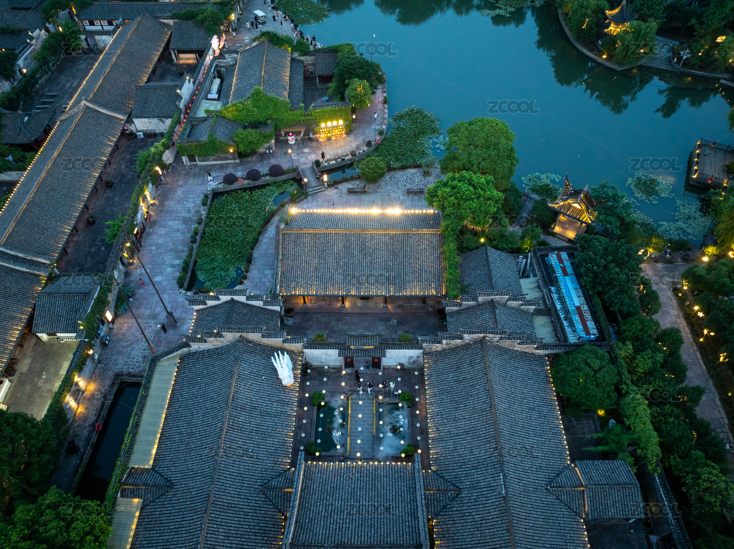 中国江苏苏州木渎古镇严家花园夏季航拍
