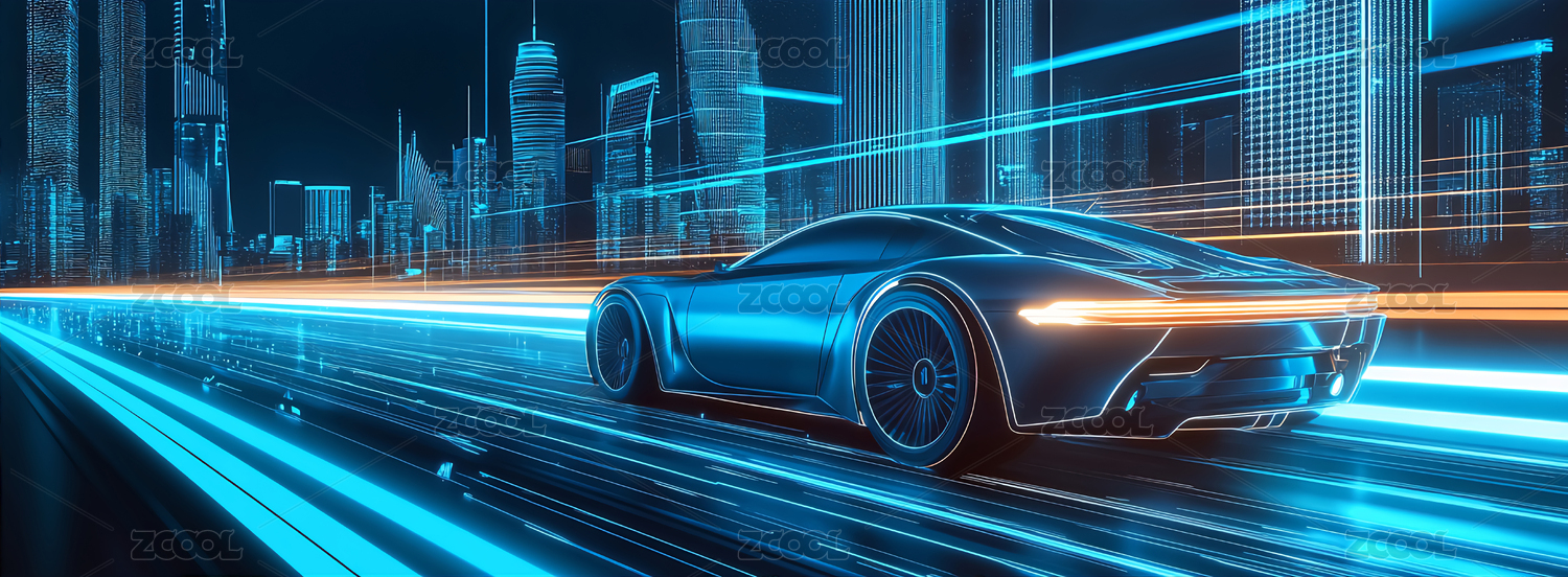 新能源,电动,汽车,未来,蓝色,城市,天际线,全息,光束,人工智能