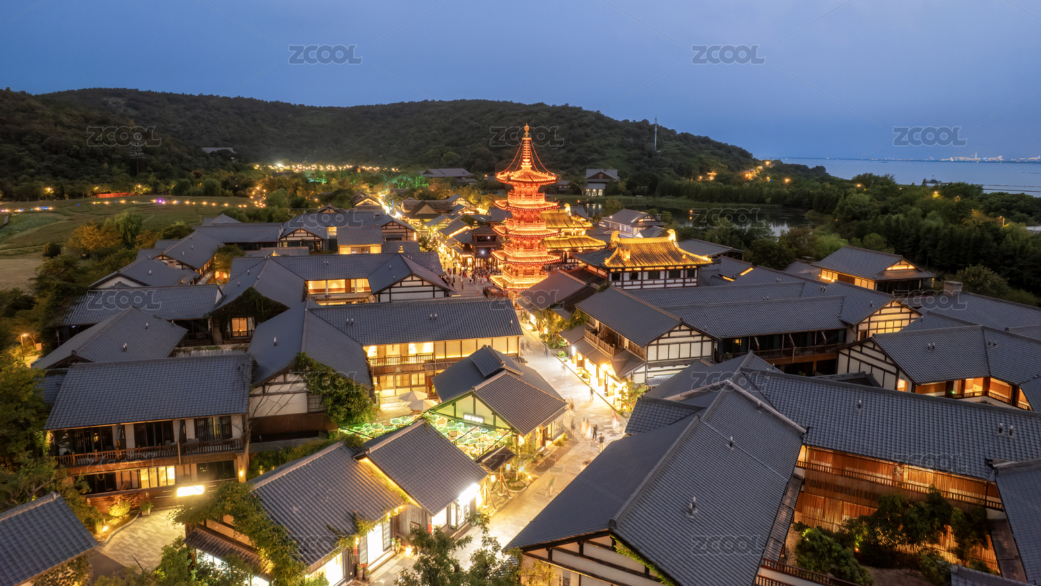 航拍无锡太湖湖畔拈花湾风情小镇夜景