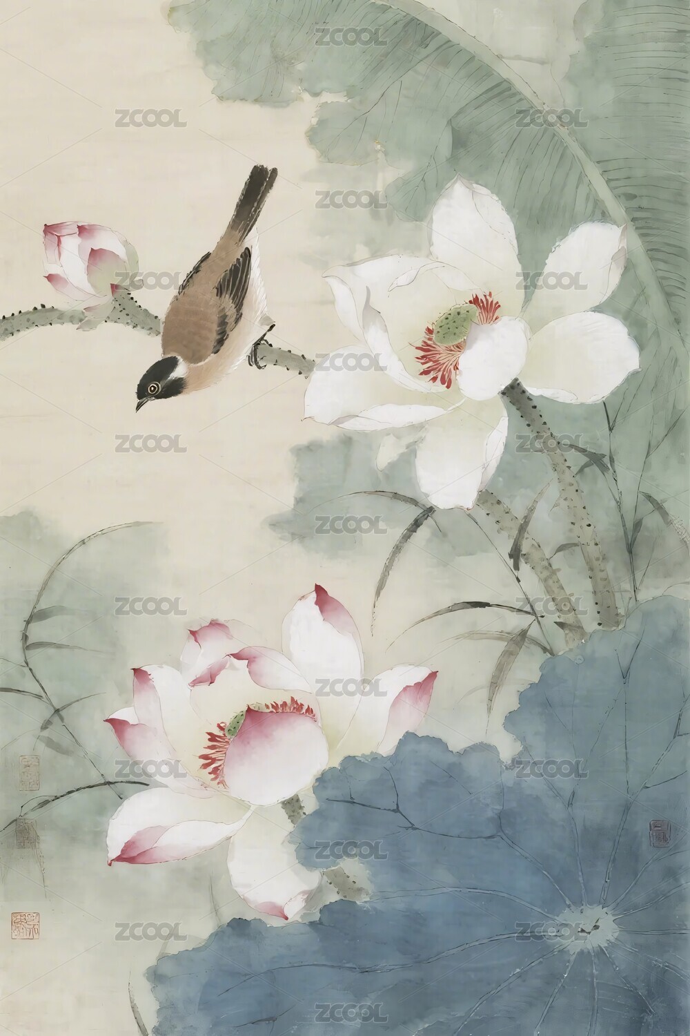 荷花和蝴蝶的水墨插图,一只鸟停在荷叶上