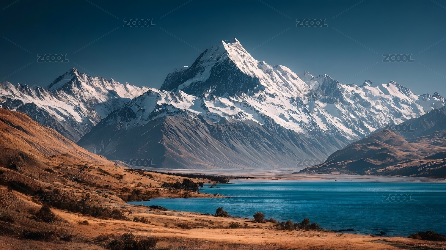 唯美的雪山枯萎的草地冰川溪流风景油画